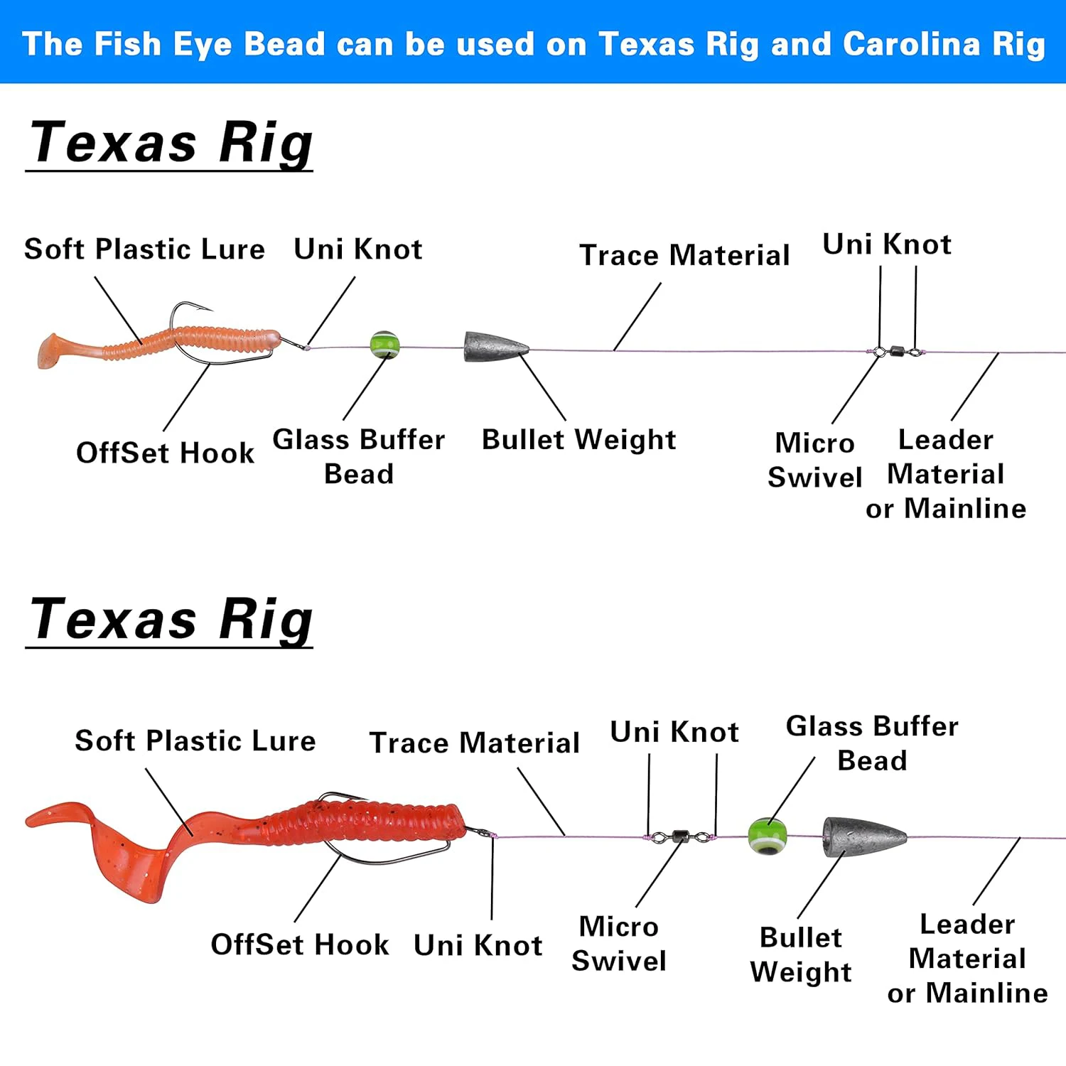 Las cuentas de pesca parecen sus ojos de pez, pueden atraer más peces y hacer que el cebo sea más realista.Perfecto para plataformas Texas, plataformas Carolina, plataformas de flounder, plataformas deslizantes, etc.