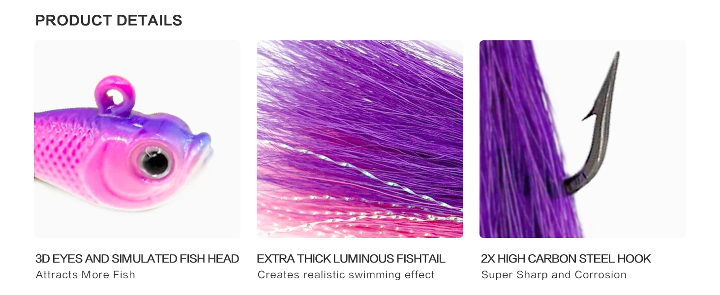 [Diseño realista] Los señuelos de pesca Bucktail presentan un diseño realista con una apariencia holográfica escamosa y ojos 3D para una apariencia realista que atrae una amplia variedad de peces.La adición de colores luminosos mejora aún más la visibilidad, especialmente en condiciones de poca luz, brindándole una ventaja al pescar.