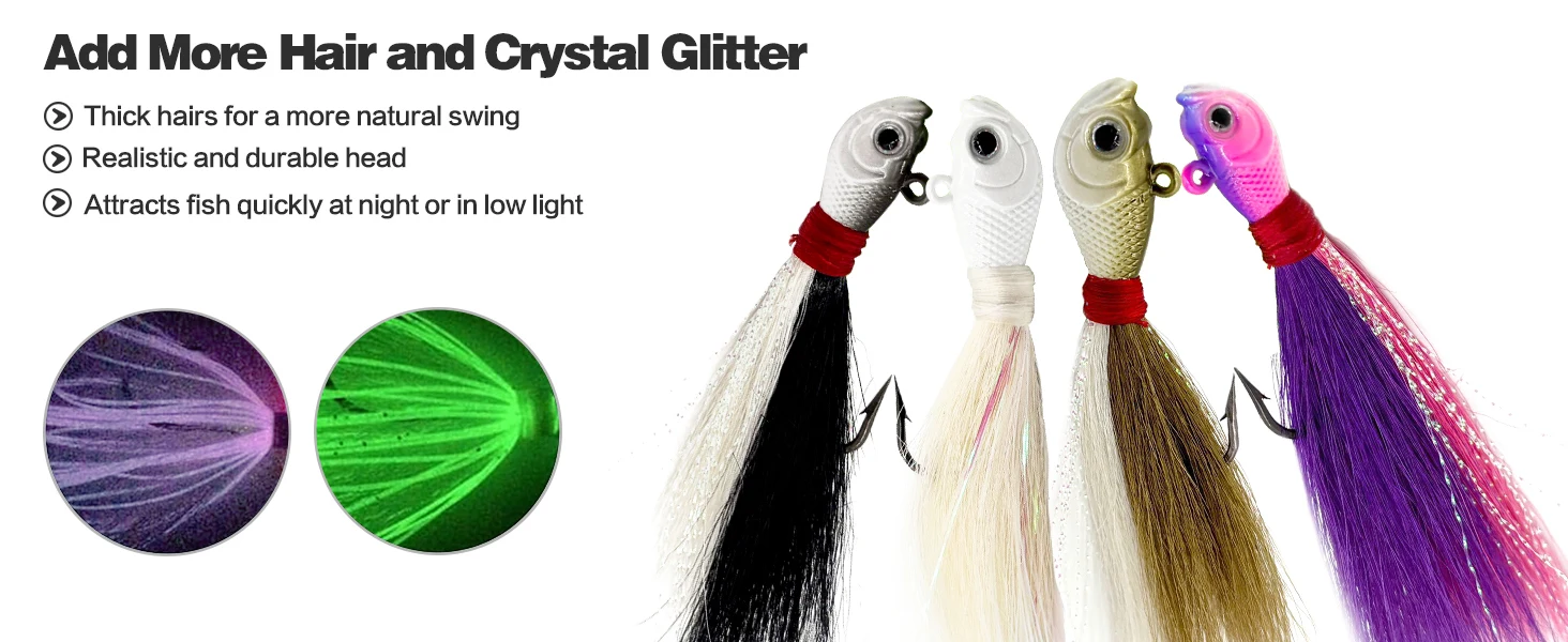 [Material premium] Las plantillas Bucktail están cuidadosamente elaboradas para imitar el movimiento natural del pelo de los ciervos, haciéndolas irresistibles para los peces depredadores tanto en ambientes de agua dulce como salada.El material de primera calidad y los ganchos afilados garantizan durabilidad y un rendimiento confiable en cada lanzamiento, lo que los convierte en una adición versátil a su caja de aparejos.