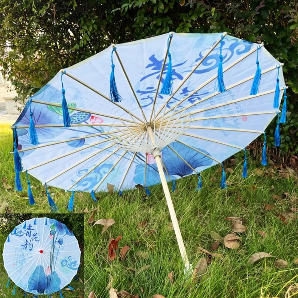 Abanico de paraguas de 56cm, tela de seda de estilo antiguo chino, Cosplay Hanfu, paraguas de papel al óleo, borla de 10 colores