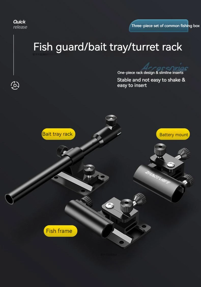 Accesorios de caja de pesca, juego de tres piezas, estante de torreta de aleación de aluminio y magnesio, cesta de pescado, caja de cebo, negro y rojo