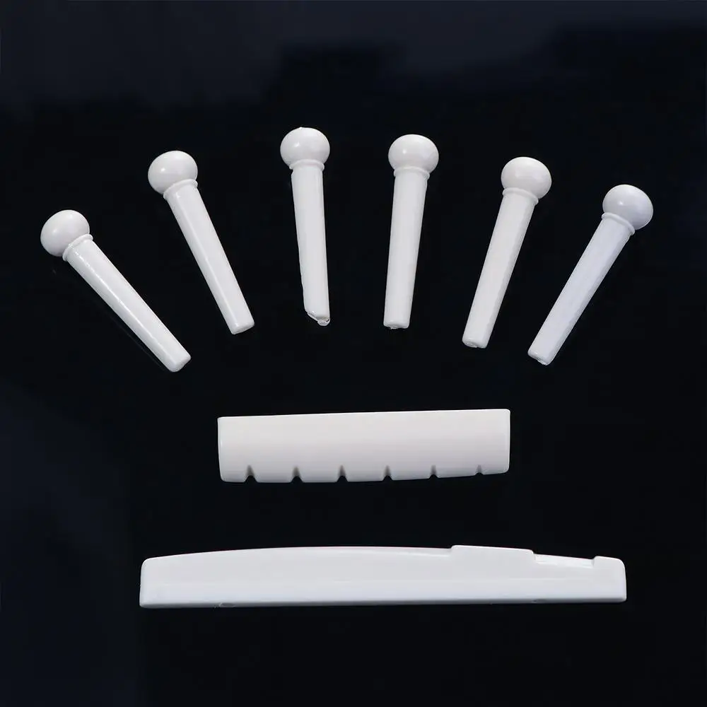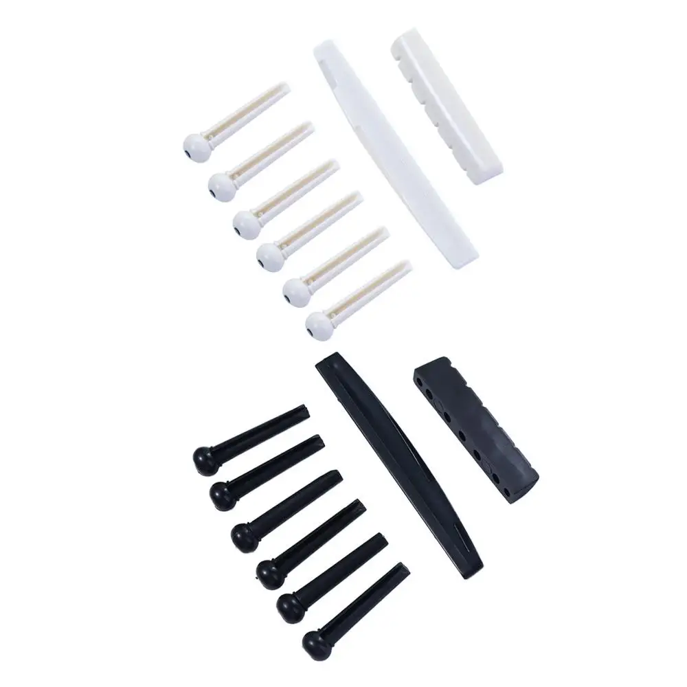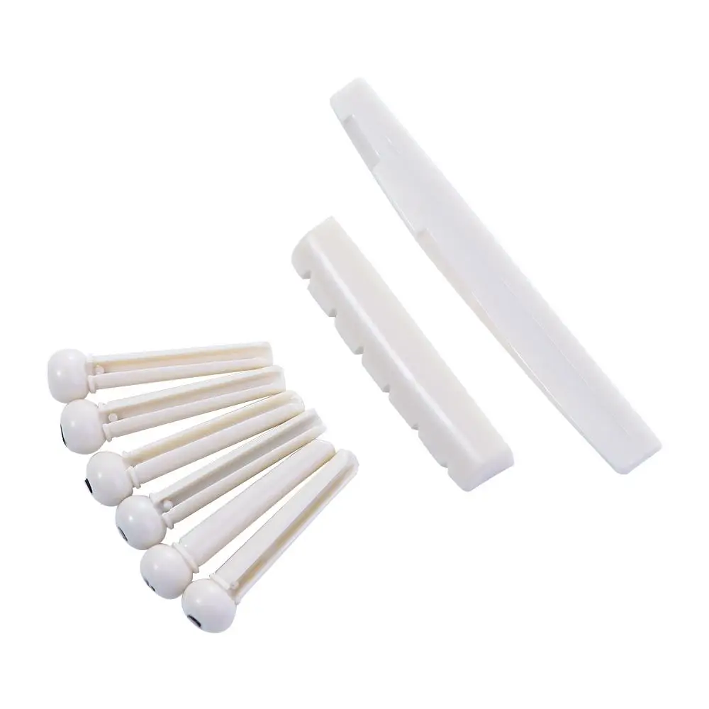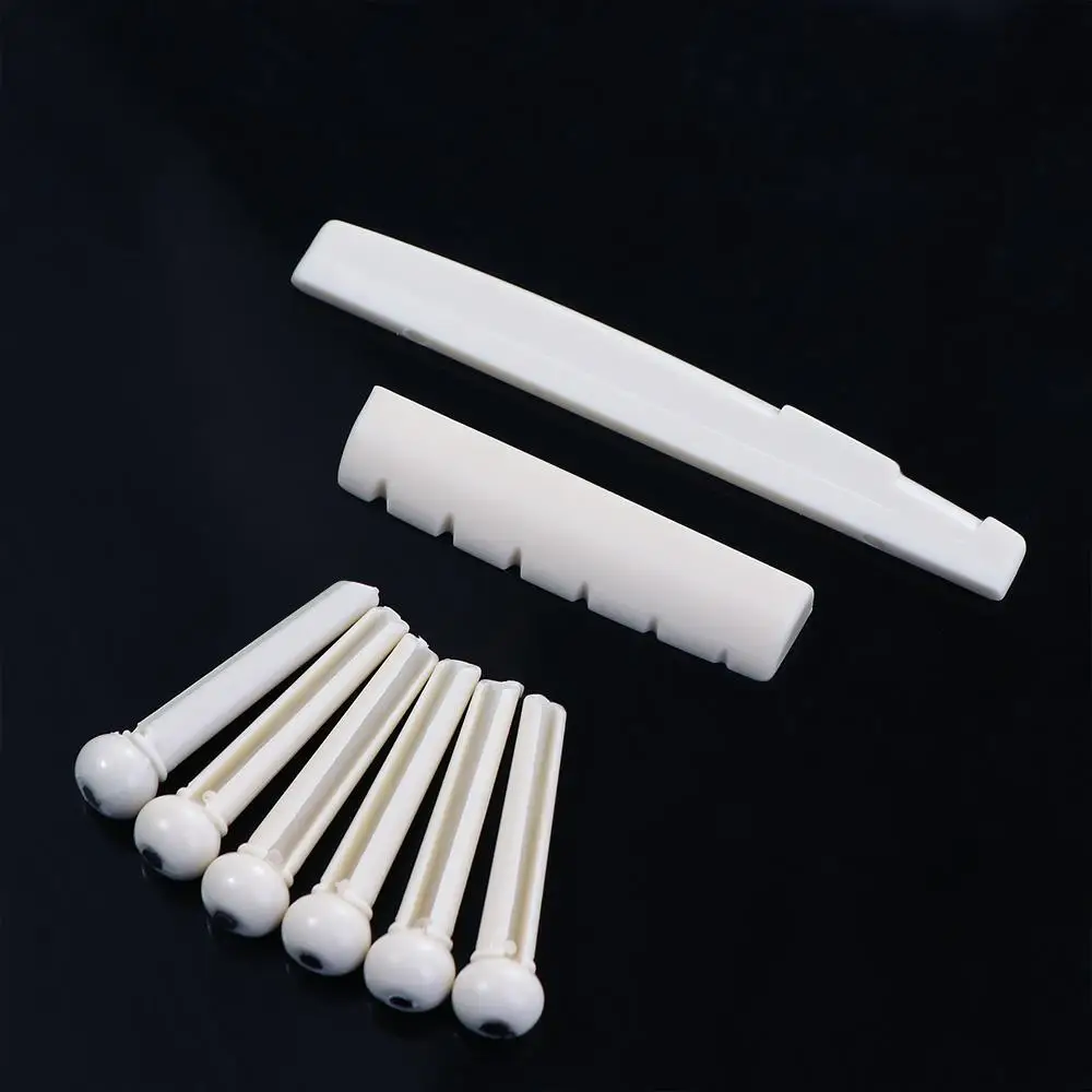 Material: Plastic Color: White / Black Guitar Saddle: Approx.72mmX3mmX8.5mm Guitar Nut: Approx.43mmX6mmx8.5mm Guitar Pins: Overall length is 1.175" (29.75mm) Slot width is 0.075" (1.93mm) Package Including:1 x Saddle,1 x Nut,6 x Bridge Pins Feature: Portable and easy use Suitable for any brand acoustic guitar