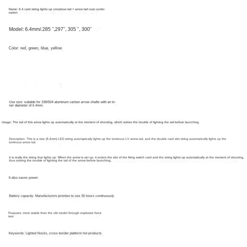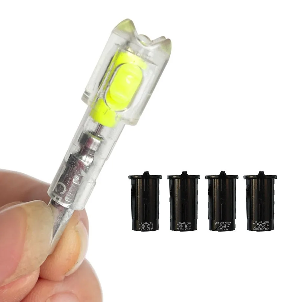 Features: 1. 4 DIFFERENT INNER DIAMETER: (.285/.297/.300/.305) bolts for multiple arrow setups. 2. LIGHTED DESIGN: These crossbow lighted nocks are designed to improve arrow visibility and accuracy. With 36 hours of continuous L.E.D glow, you can easily find your arrows in the dark. 3. COMPATIBILITY:Lighted crossbow nocks for arrows with an inside diameter of 285/0.297/0.300/0.305 inches. The luminous crossbow arrow holder is suitable for arrows with an inner diameter of 6.4mm. 4. DURABLE CONSTRUCTION: Made of high quality materials to withstand the impact of crossbow fire. 5. BUILT-IN RECESSED SWITCH: With a recessed switch design, our lighted nocks prevent accidental power-off when the arrow passes through objects, ensuring continuous illumination for enhanced tracking. Specifications: 1. Suit for: 6.4mm/.285", 297", 305", 300" 2. Color: red/green/blue/yellow 3. Usage size: suitable for 338/504 pieces of aluminum carbon arrow shafts with an inner diameter of 6.4MM Package includes: Lighted Arrow Nock*1Pc Crossbow Bolts*4Pcs