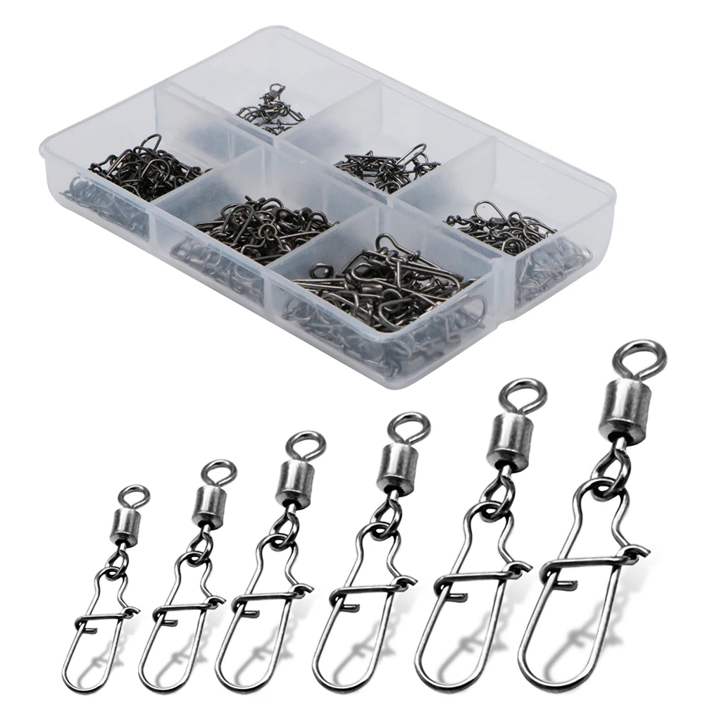 120 Uds. 6 tamaños accesorios de pesca conector Pin rodamiento giratorio de acero inoxidable Snap Fishhook Lure Swivel Tackle Box Tool