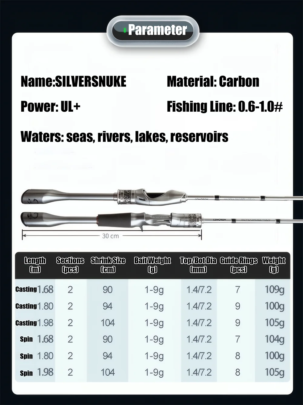 * Longitud de la varilla 1,8 m / Longitud retráctil 94 cm / Peso de la varilla 100 g (0,22 lbs) / Peso del cebo 1-9 g (0,03 oz-0,32 oz) / Diámetro de la punta 1,4 mm / Diámetro inferior 7,2 mm / 9 anillos guía