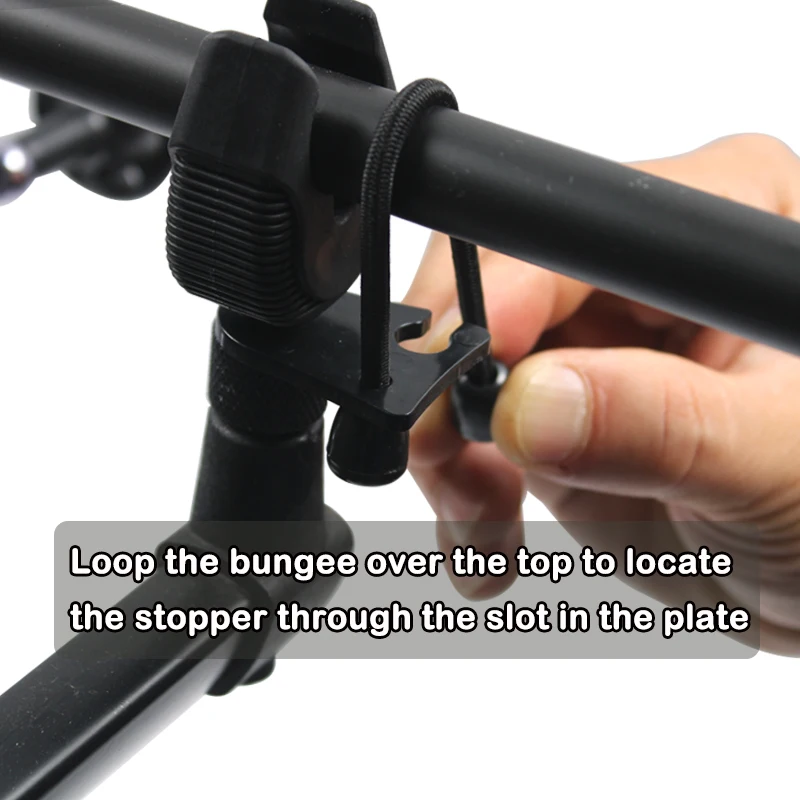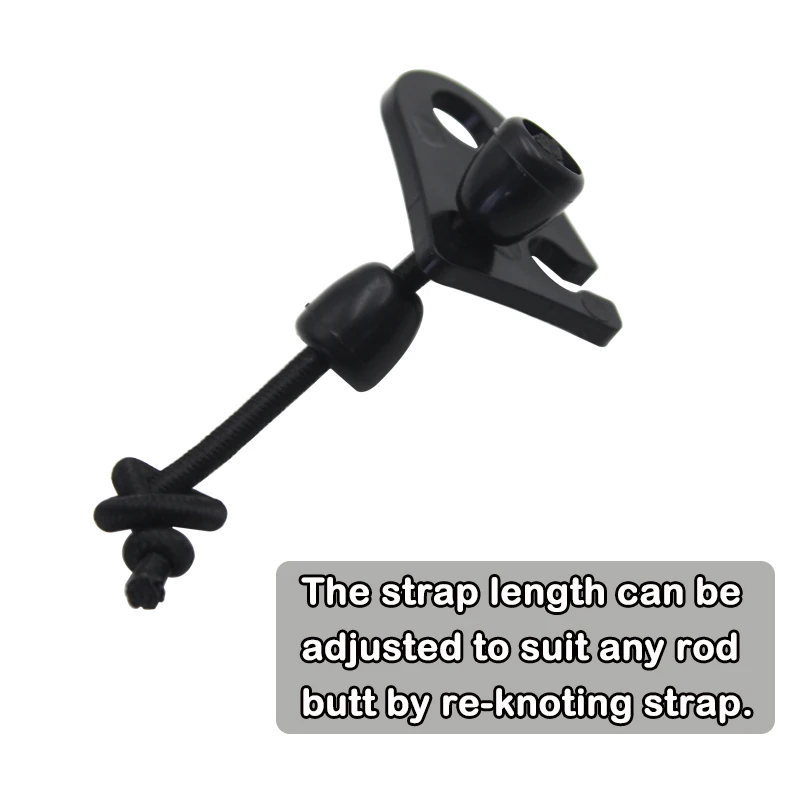 Butt Bungee Rod lock has been designed to stop rod being pulled out on a savage bite.Simply screw your butt rest through the plate and then loop the bungee over the top to locate the stopper through the slot in the plate. The strap length can be adjusted to suit any rod butt by re-knoting strap. With a simple stretch to release the rod in a second.