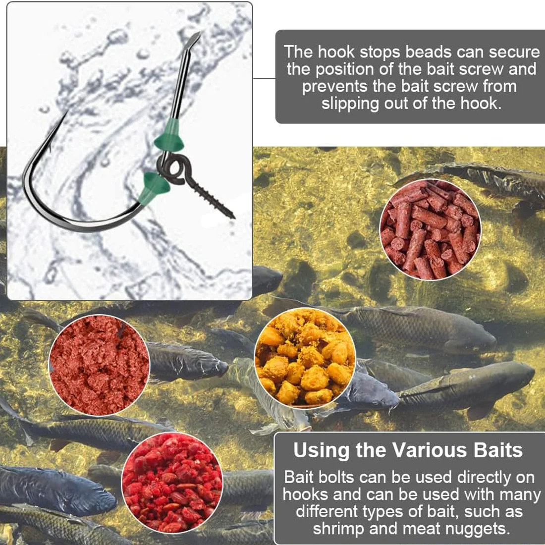 Juego perfecto: el tornillo de cebo boilie de pesca puede asegurar mejor el cebo sin afectar el uso del anzuelo. Los topes de gancho pueden asegurar la posición del tornillo de cebo y evitar que el tornillo de cebo se salga del gancho.