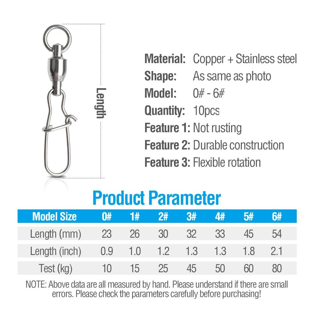 Material:Copper+Stainless Steel Color:Silver Quantity:10pcs Size:0#,1#,2#,3#,4#,5#,6# Package includes:10pcs Fishing Swivels Feature: 1.This product is made of high-manganese steel, super stainless steel processing, anti-rust capability, excellent corrosion resistance. 2.The work is very delicate, professional polishing technology, smooth surface, bright color. 3.360 degrees rotation to rotate flexible, so easy to tie fishing groups, suitable for connecting various fishing groups. 4.double insurance, is not easy to hurt the line, in the case of a strong rally, but also the flexibility to rotate. 5.The main fish , tension moderate, can ease the impact, the protection of the line to prevent pull off.