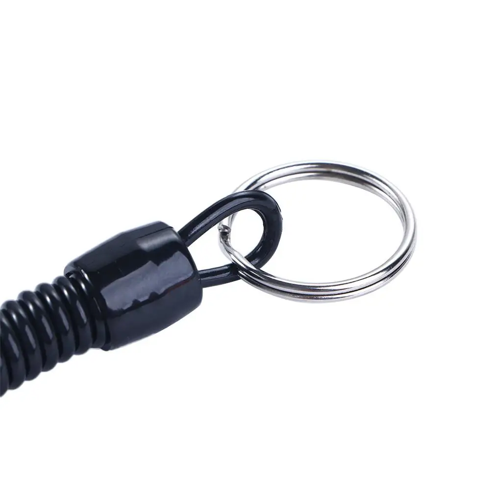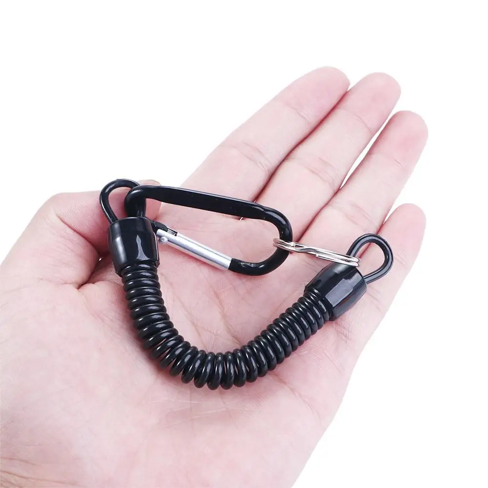 Material: TPU Wire diameter: 2.5mm Roll diameter:10mm Total length:12CM Carabiner color:Random Package includes:1pc spring rope with keyring and carabiner Features: Made of quality material,practical and durable Lightweight and easy to carry Ideal for securing pliers, lip grips, tool rods, and reels for camping, fishing and general use Aluminium carabiner on one end and iron ring on the other end can attach your gear to your belt or boat or kayak