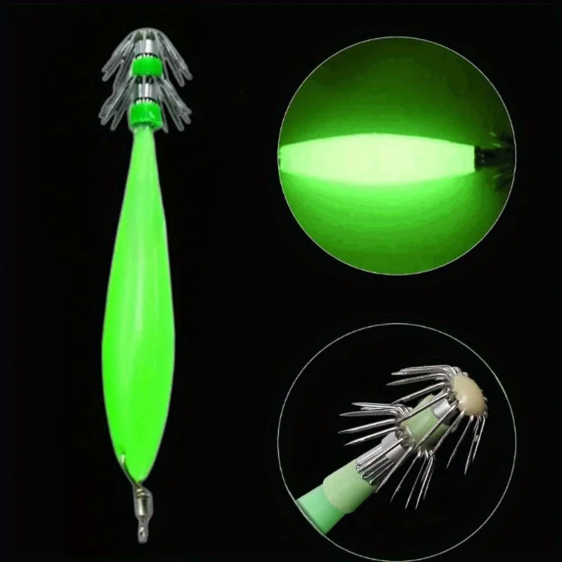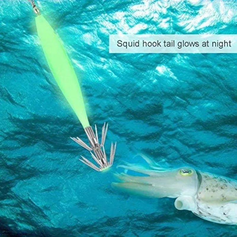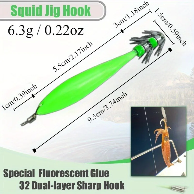Lista del paquete: 5 unids/set ganchos luminosos de calamar Detalles del producto Material: PP + acero inoxidable Tamaño: 9,5 cm/3,74 pulgadas, 6,3g/0,22 oz Característica: Ideal para peces manga, calamares, pulpos y sepias en agua dulce o salada. Cada Plantilla de calamar fluorescente viene con ganchos afilados de doble capa que lo hacen más fuerte y afilado. Con cuerpo luminoso, la plantilla de calamar puede brillar en la oscuridad para atraer al calamar, le ayuda a atrapar peces grandes. Plantillas de calamar luminosas con giro frontal de calidad para eliminar los giros de línea, hacen que las plantillas de calamar sean más prácticas de usar.