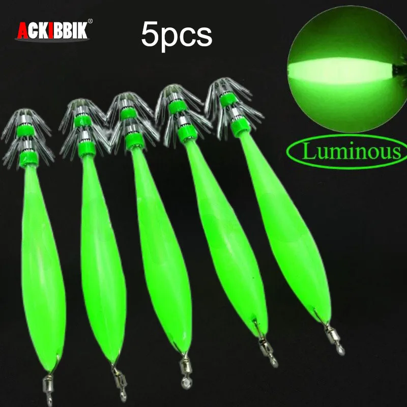 Lista del paquete: 5 unids/set ganchos luminosos de calamar Detalles del producto Material: PP + acero inoxidable Tamaño: 9,5 cm/3,74 pulgadas, 6,3g/0,22 oz Característica: Ideal para peces manga, calamares, pulpos y sepias en agua dulce o salada. Cada Plantilla de calamar fluorescente viene con ganchos afilados de doble capa que lo hacen más fuerte y afilado. Con cuerpo luminoso, la plantilla de calamar puede brillar en la oscuridad para atraer al calamar, le ayuda a atrapar peces grandes. Plantillas de calamar luminosas con giro frontal de calidad para eliminar los giros de línea, hacen que las plantillas de calamar sean más prácticas de usar.