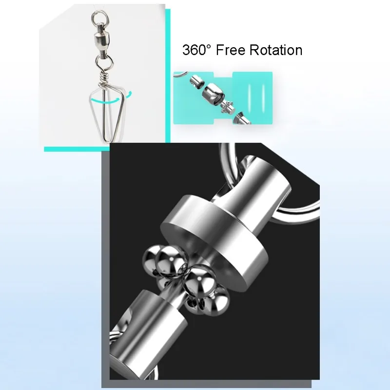 Gira de pesca de servicio pesado: las bolas de acero en el interior del vástago giratorio se benefician para soportar vientos fuertes y giros serios, sin roturas ni fallas.