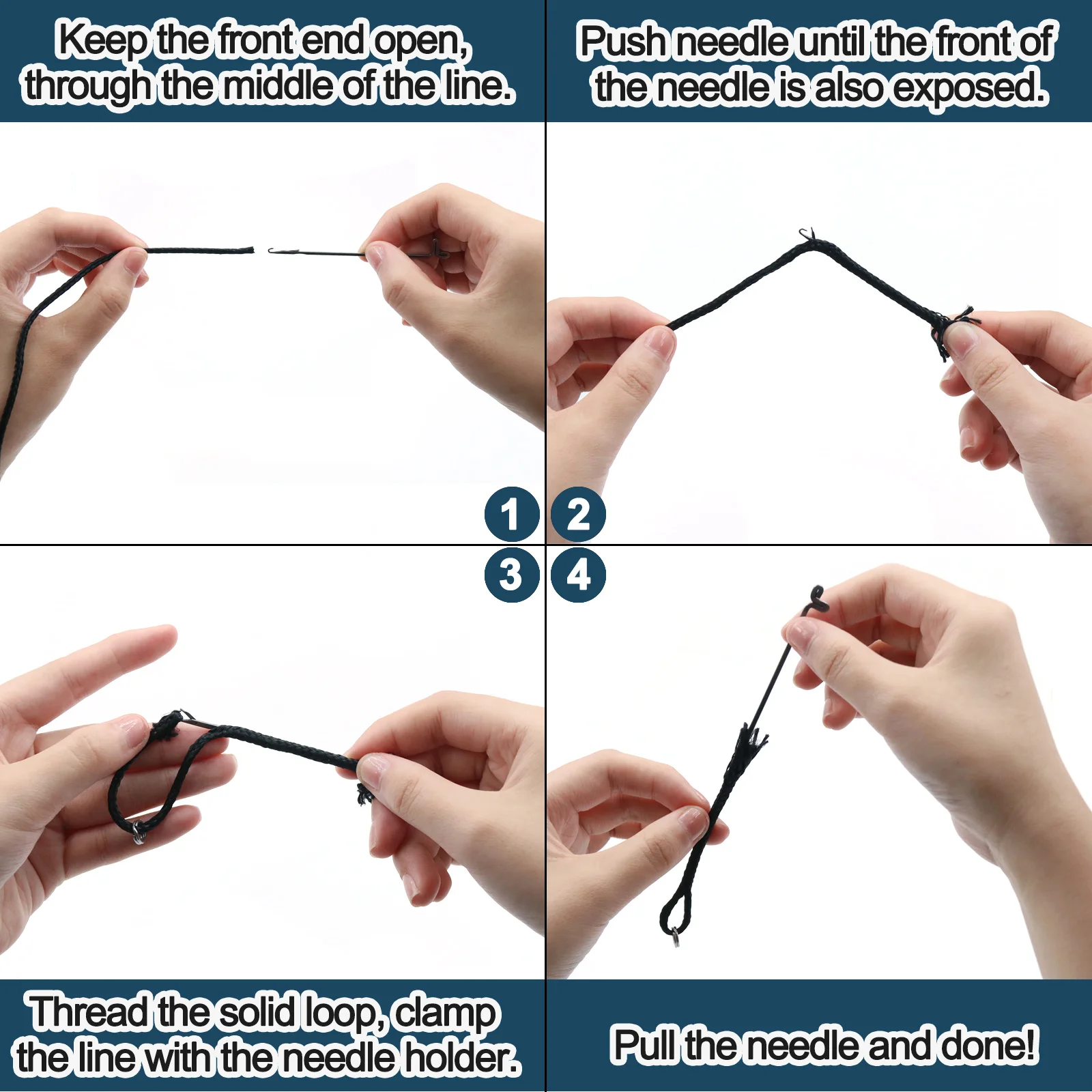Paso 2-Enhebre la aguja a través del medio de la cuerda hasta que el retenedor en la parte delantera de la aguja también esté expuesto.