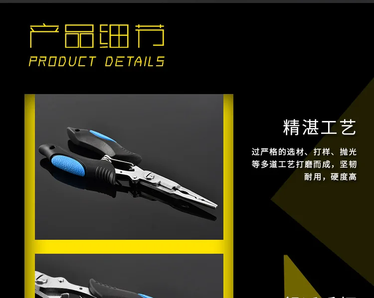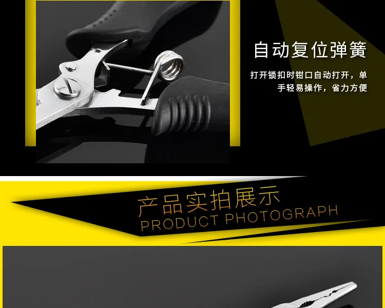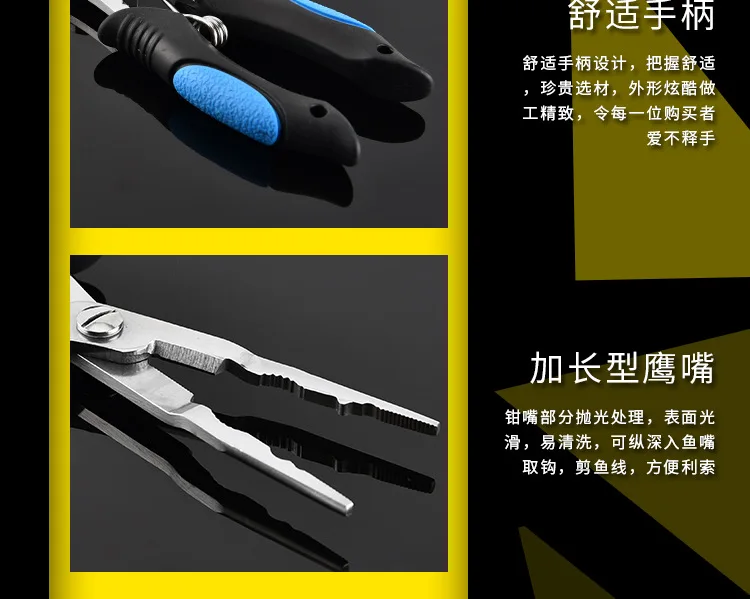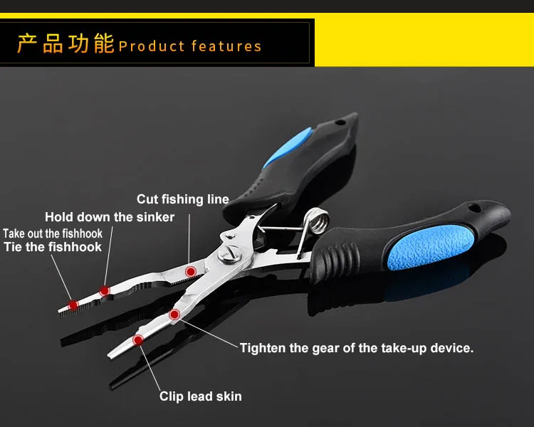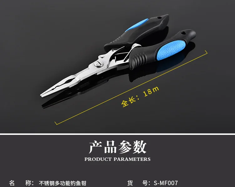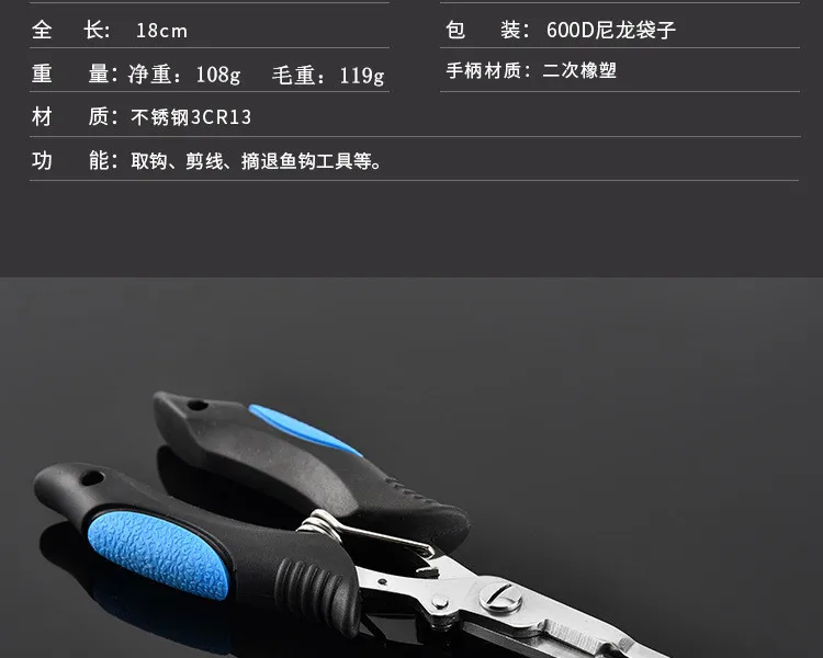 Tipo de producto: Alicates de pescaMaterial del cuerpo de la abrazadera: acero inoxidable 3CR13Material del mango: caucho secundario y plásticoLongitud del producto: 18cmPeso: 108gCantidad: una piezaFunción: Coger el gancho, recortar la línea, quitar la Herramienta de gancho, etc.