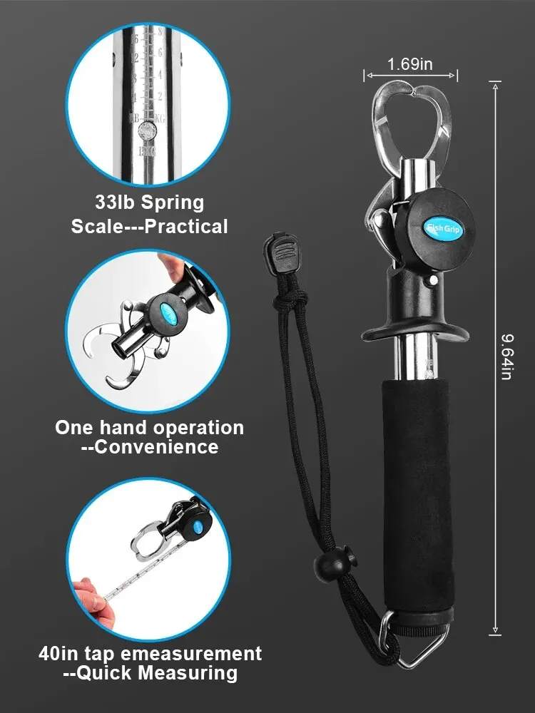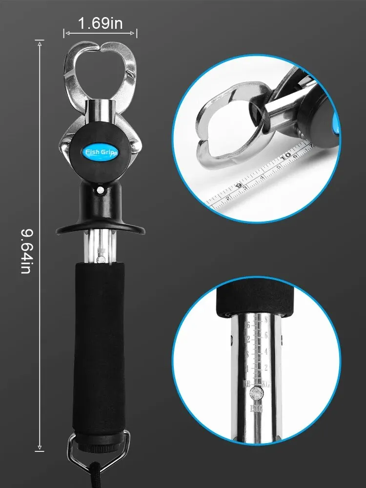 3. Conozca el peso del pez: Con un diseño de pesaje incorporado, esta pinza de labios de pescado puede pesar hasta 18kg de peces de manera fácil y precisa. No es necesario llevar una báscula separada o adivinar el peso de su captura. Solo agarra y levanta.