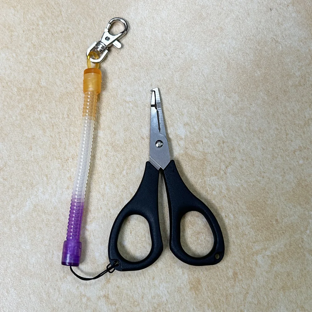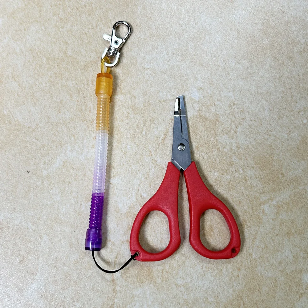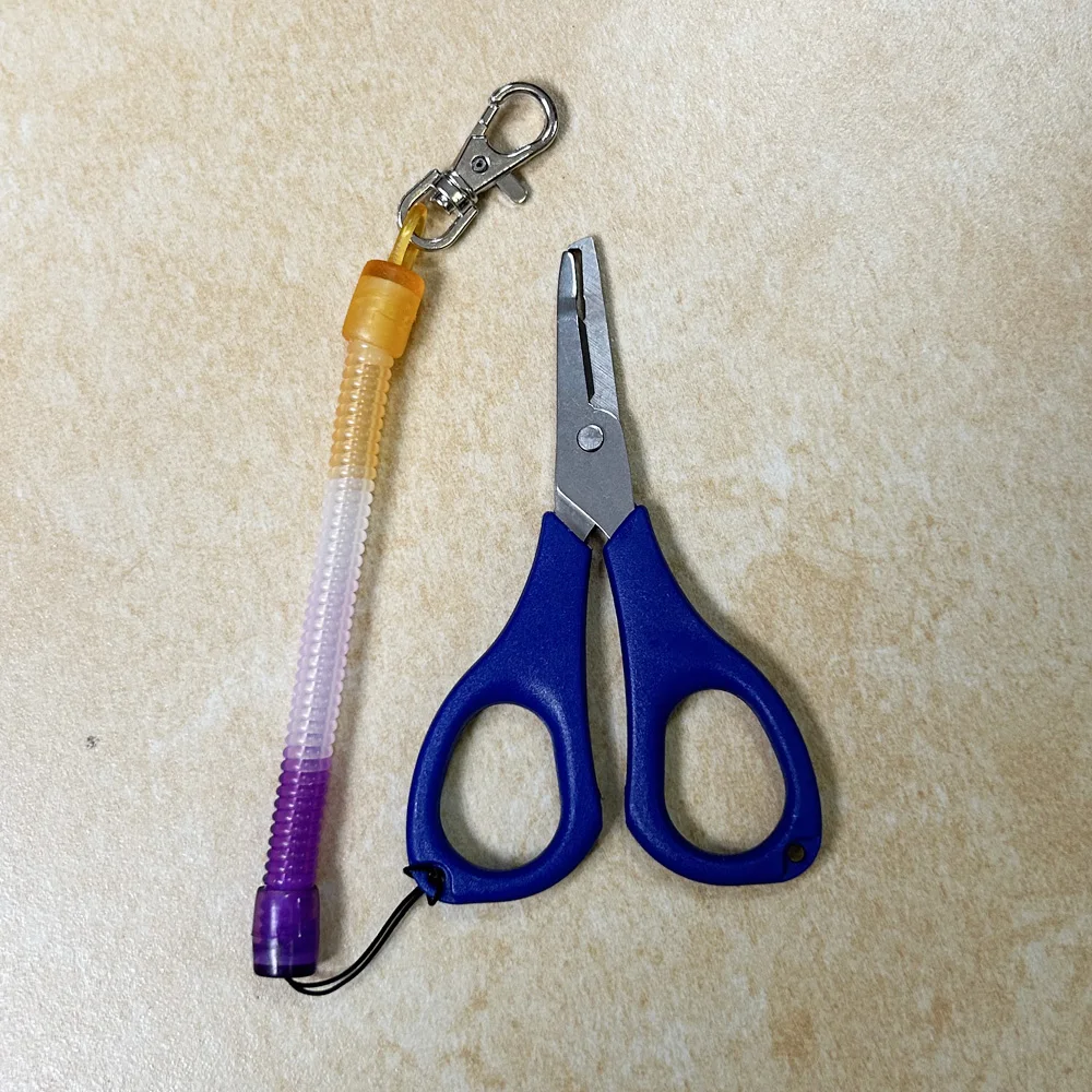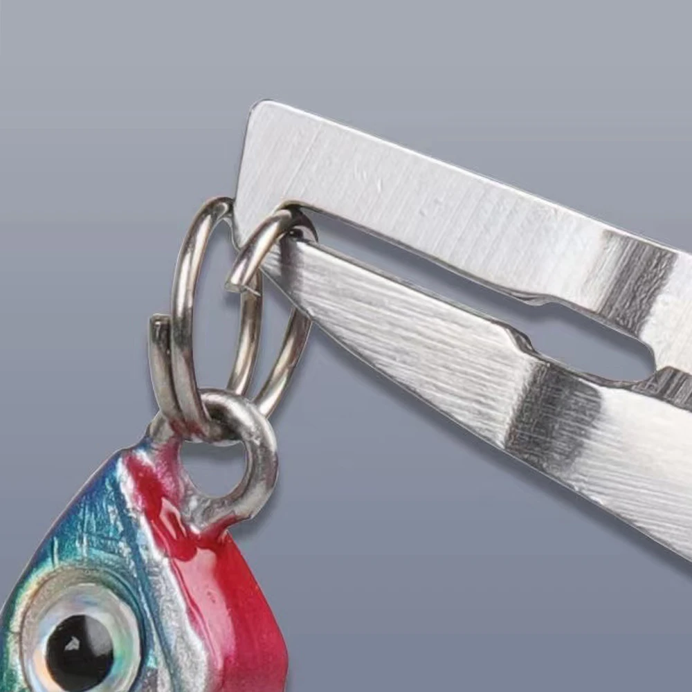 La parte de la tijera es afilada, pero es una pena que ambos lados de la hoja no sean dentados, lo cual los habría hecho aún mejores. La parte del gancho para anillos rotos está mal ajustada, lo que impide abrir los anillos pequeños; sin embargo, es perfectamente funcional para los medianos y grandes. En la foto: difícil abrir el anillo roto a la derecha de las tijeras azules (talla triple 10), sin problema para las demás. El problema proviene de un control de calidad suboptimal; el espacio entre el gancho y la otra hoja es diferente dependiendo de las tijeras (el espacio entre la hoja y el gancho es más grande en la roja que en la azul, cuando no debería haber ninguno). El mosquetón que sujeta las tijeras es de plástico y debe ser reemplazado urgentemente.
