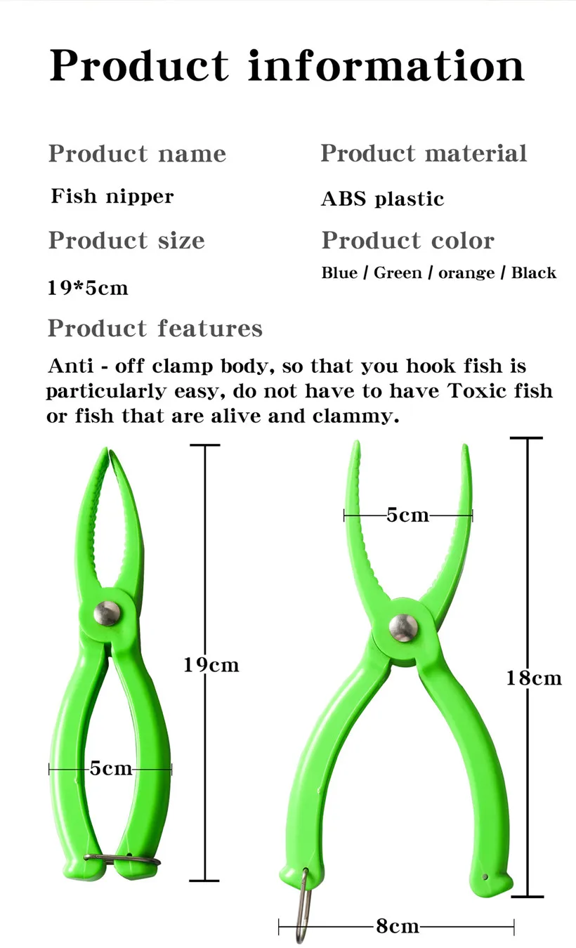 ABS PlasticFish Catcher Fish Controller Road Ya Alicates Fish Clipper Equipo de pinzas de pesca Dispositivo de bloqueo de peces Especificación: Material: ABS Color: negro Longitud total: 19cm Anchura de la abrazadera: 5,5 cm Ancho del apretón de manos: 5cm Peso: aproximadamente 60g Tipo: Clip de pescado