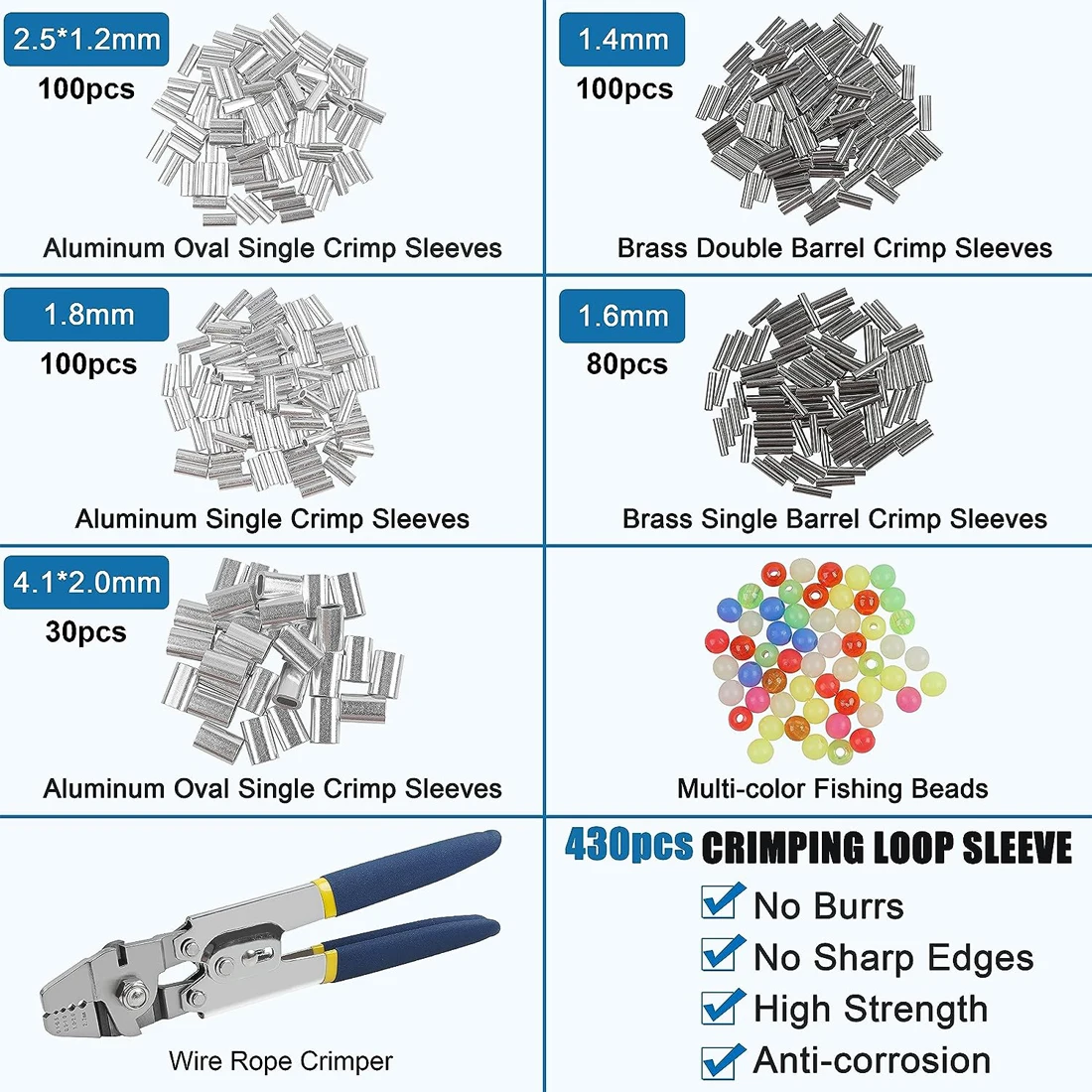 3. En este juego de herramientas de prensado de pesca, incluye un alicates de prensado de pesca de alta resistencia y un kit de manguitos de crimpado de barril de cobre de aluminio de 430 en 5 tamaños, puede ser ampliamente utilizado para líderes de pesca, cuerda de alambre, cable, correa para perros, etc.