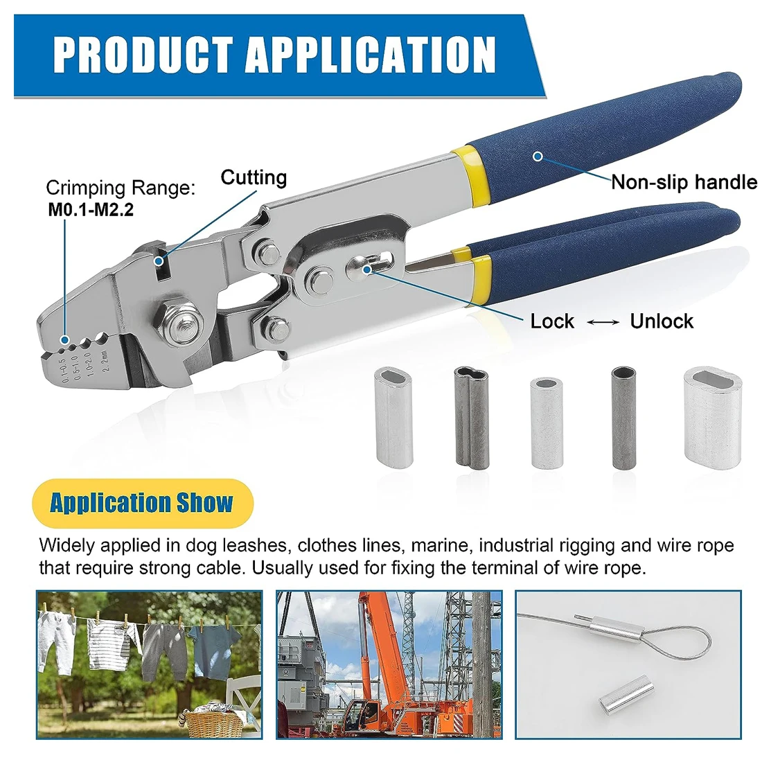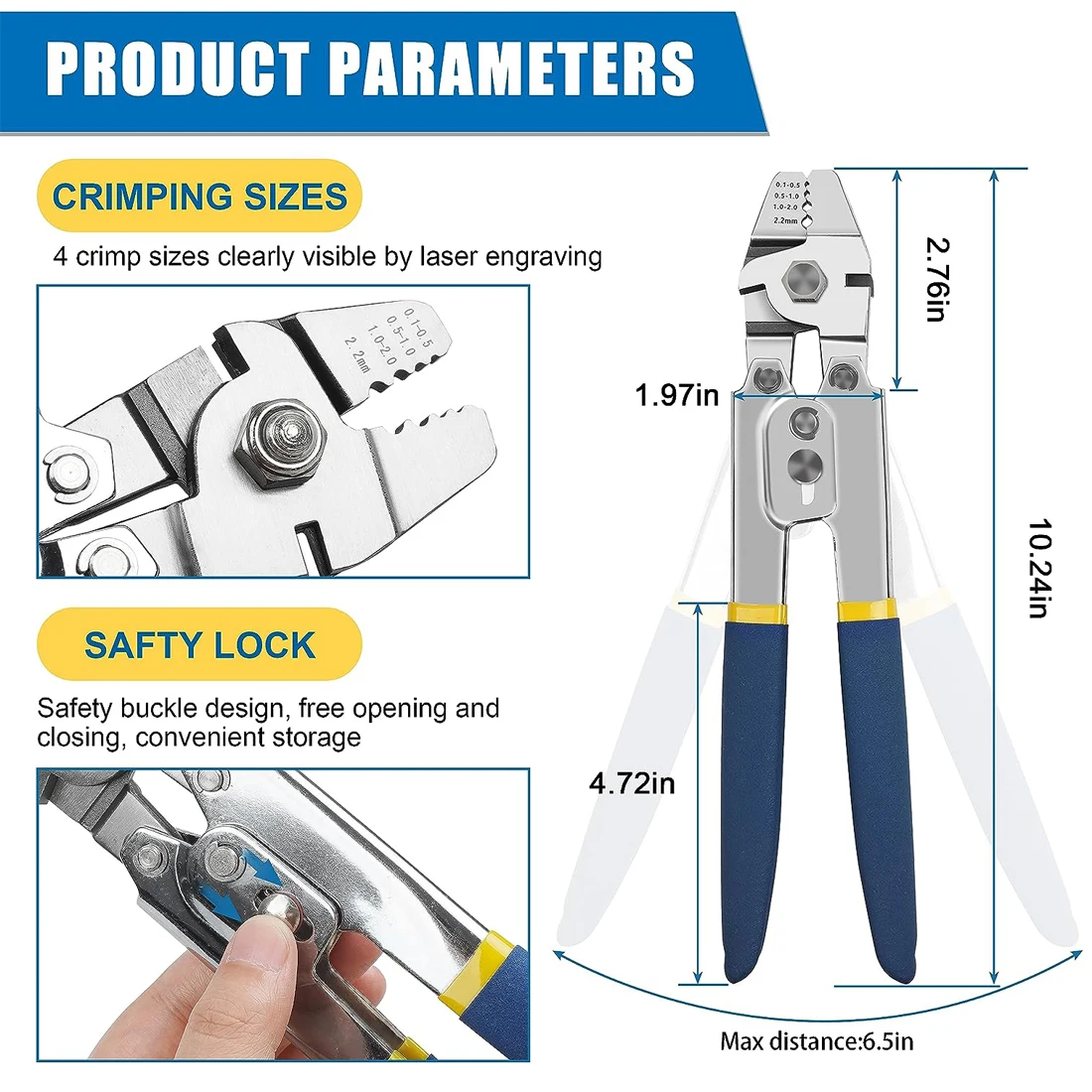 2. Herramienta de engaste de línea de pesca con empuñaduras antideslizantes acolchadas y diseño de mecanismo de autobloqueo, lo que hace que sea más relajante para proporcionar una presión óptima, y el bloqueo de seguridad es una manera fácil de mantener la engarzadora cerca, proporcionando una experiencia de funcionamiento más cómoda