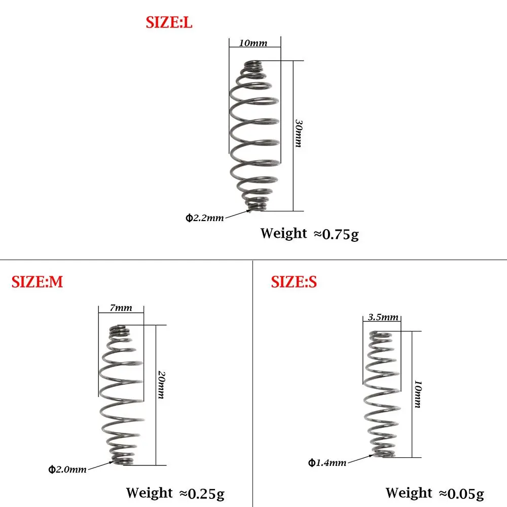Material: acero inoxidable. Tamaño: S 10mm de longitud; M 20mm de longitud; L 30mm de longitud. Color: mostrar como imágenes. Aplicación: para la fabricación de aparejos de carpa. El paquete incluye: jaula alimentadora de resorte de pesca de 50 "*. Nota: Medición manual del tamaño, permita una pequeña desviación.