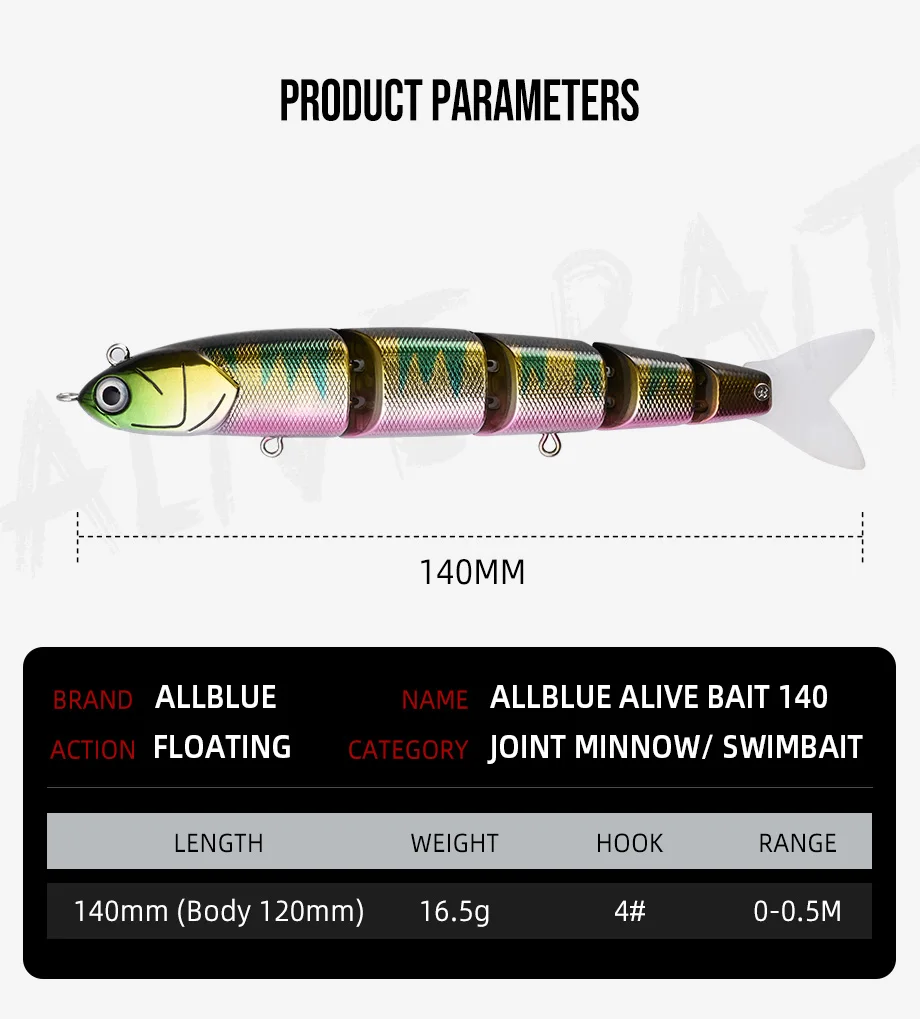 ALLBLUE ALIVE BAIT 140 es un swimbait articulado equipado con una cola de silicona en un cuerpo de 5 conexiones que logra un movimiento suave como los peces vivos.