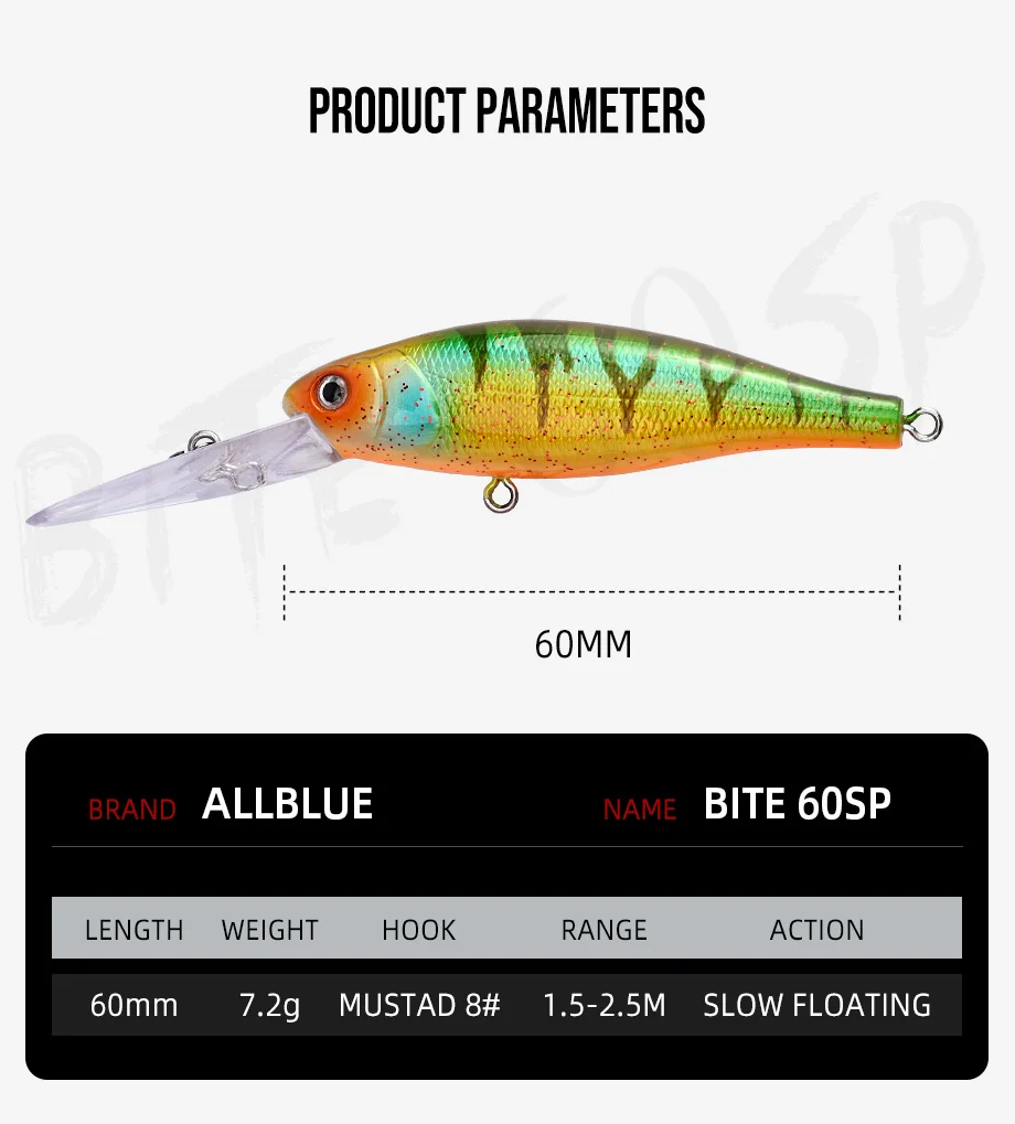 ALLBLUE BITE 60SF 60mm 7,2g pececillo flotante lento profundidad 1,2-2,5 m Wobbler señuelo de pesca duro cebo Artificial aparejos de Lucio