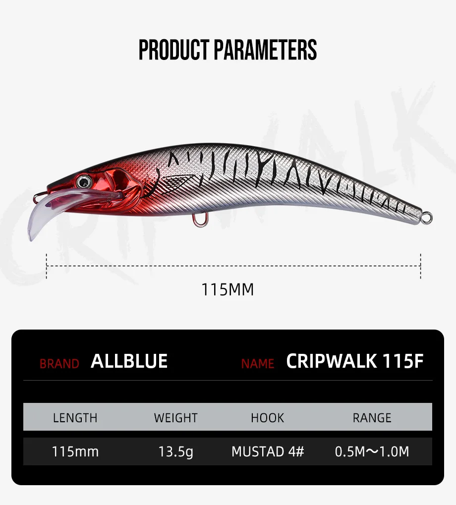 Este señuelo único presenta un diseño único de "labio de sillín" que crea una natación perfecta. Pesce este señuelo a velocidades lentas o rápidas, arrastre o pare y vaya. El Cripwalk es ideal para lubinas, lucios, almizclados, agallas azules y agua salada costera.