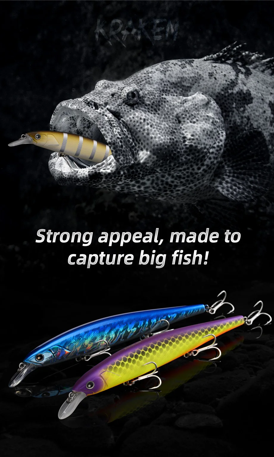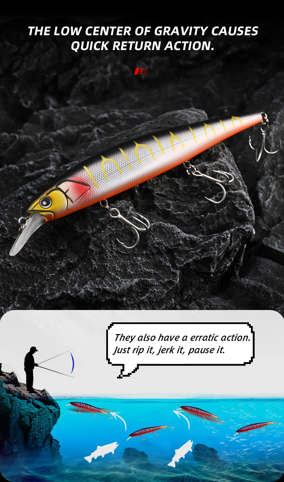 • Tipo de Señuelo Minnow :Este señuelo de tipo Minnow es ideal para la pesca en océanos rocosos, atrae a los peces de manera efectiva.