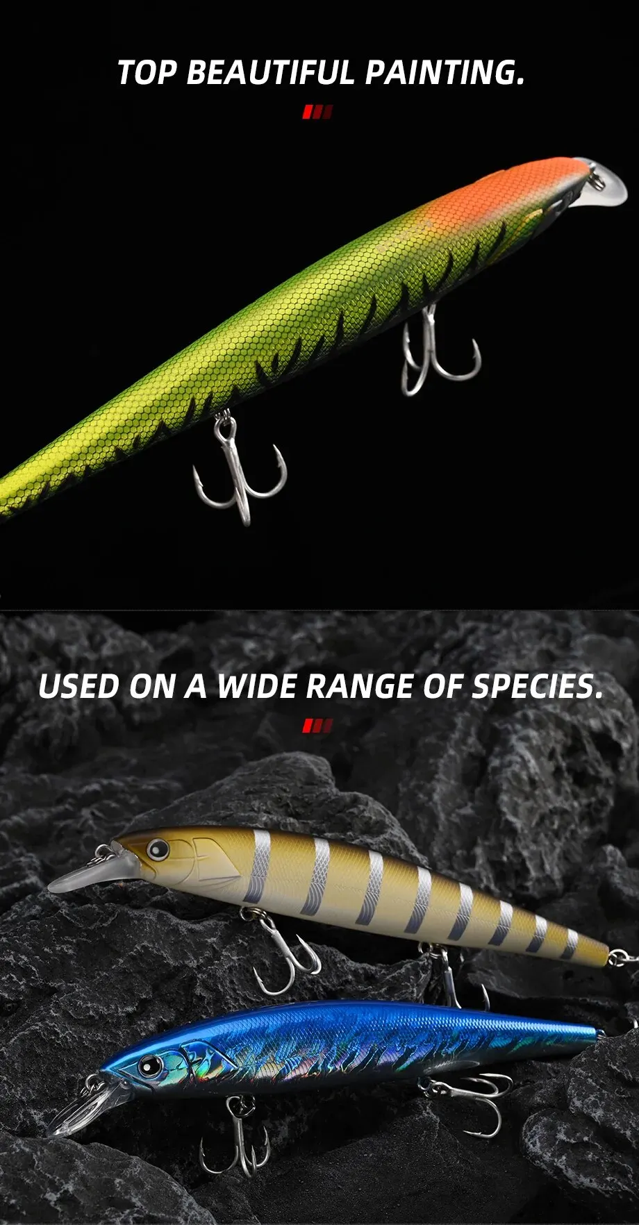 • Tipo de Señuelo Minnow :Este señuelo de tipo Minnow es ideal para la pesca en océanos rocosos, atrae a los peces de manera efectiva.