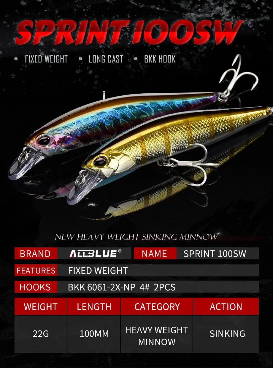 ALLBLUE SPRINT 100SW pececillo de hundimiento pesado peso fijo Jerkbait señuelo de pesca 100mm 22G fuera de la costa agua salada lubina cebo aparejos