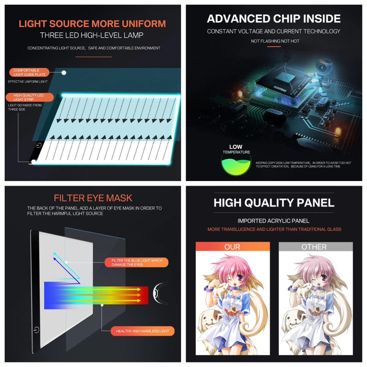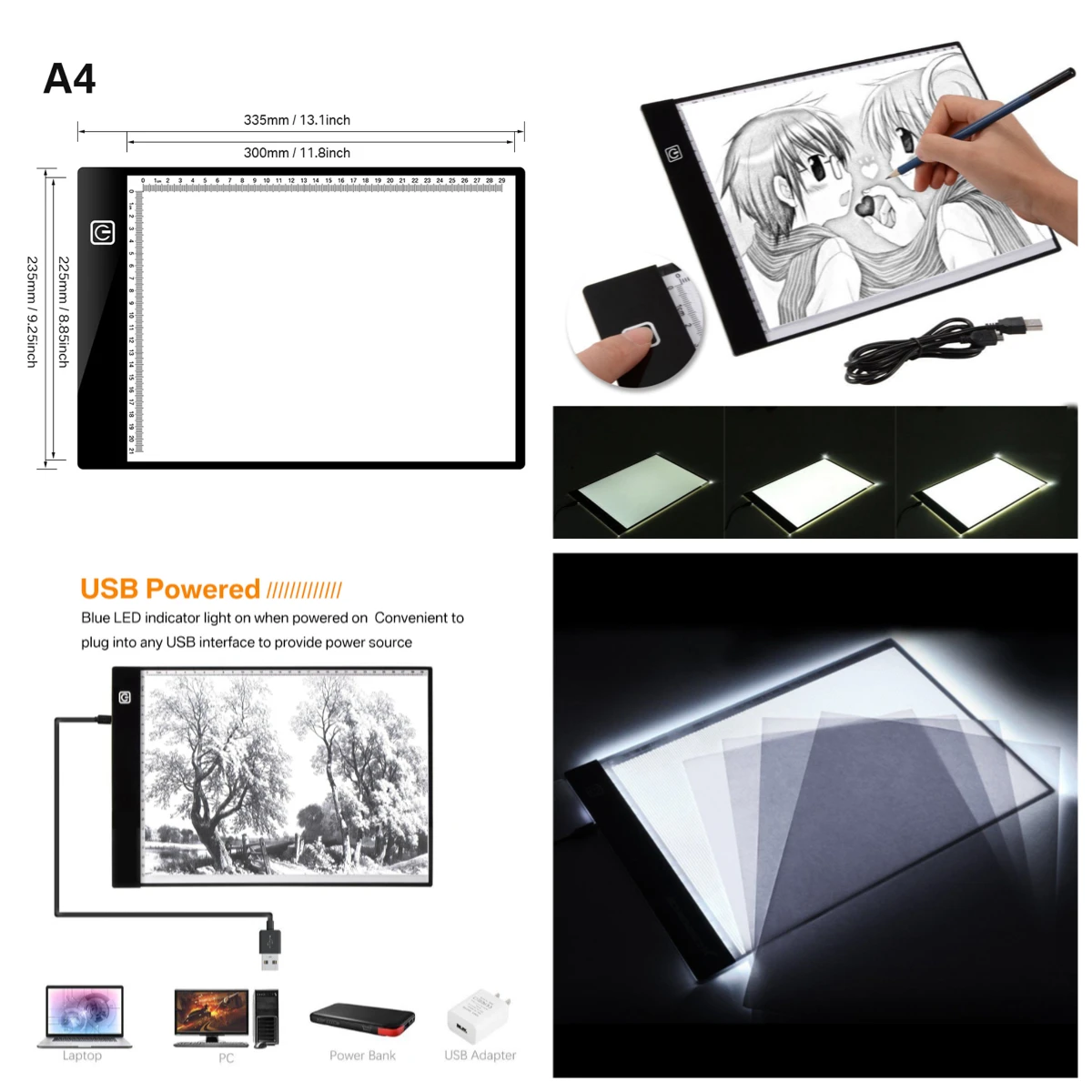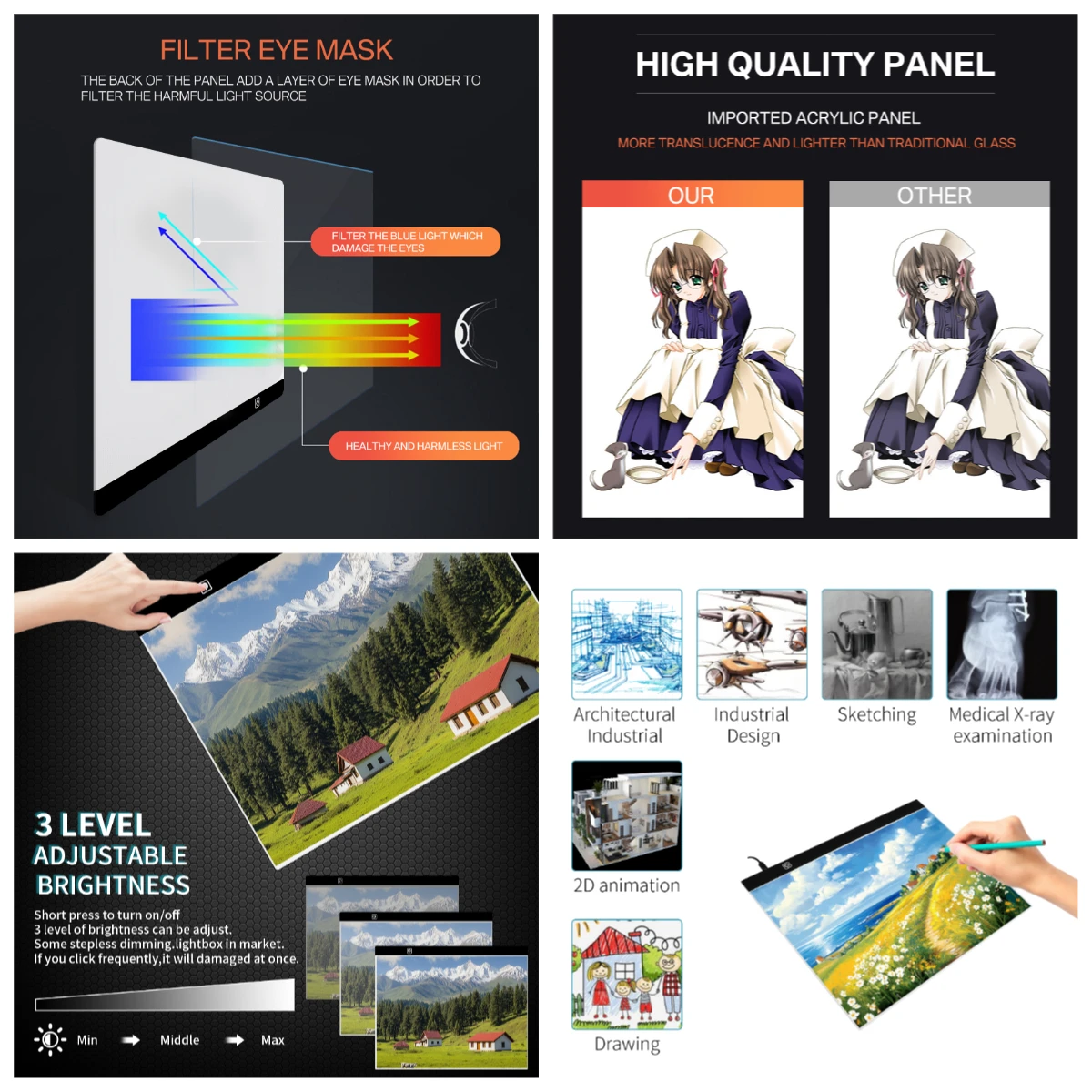 Función múltiple:Este tablero de luz LED es ideal para pintura de diamantes de precisión, extensiones, animación 2D, caligrafía, relieve, álbumes de recortes, bocetos, visualización de rayos X, dibujos, etc.Un gran regalo en Navidad, boda, cumpleaños, aniversario para niños, profesores y amigos.