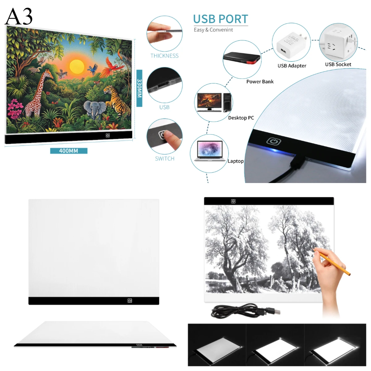 Almohadilla de luz A3 para pintura de diamantes, deshierbe, dibujo de bocetos de viniloCaja de luz de rastreo recargable y portátil, puede llevarla a cualquier lugar con usted fácilmente a diferencia de una caja de luz tradicional.Esta almohadilla de luz LED es una elegante almohadilla de iluminación. La luz de la almohadilla a través del papel ilumina claramente las imágenes, lo que facilita el seguimiento de las imágenes.Brillo regulable, modo de 3 colores de luz y 6 niveles de brillo regulable continuamente para que obtenga el brillo deseado que desee.Alimentado por batería (incluida), lo que significa que si necesita sacar el artículo para dibujar o trabajar, puede cargarlo con anticipación y se puede usar de forma inalámbrica.Diseño de interruptor táctil, solo necesita tocar el botón en la almohadilla para encender/apagar su caja de luz y cambiar el brillo.