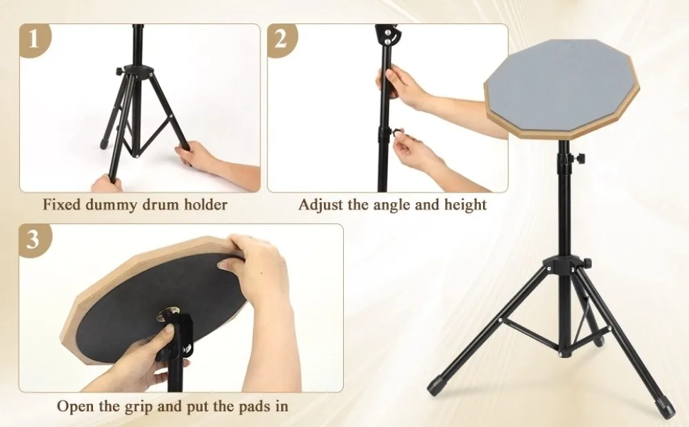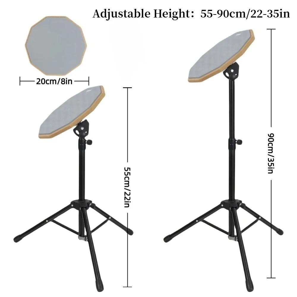 *Drum Pad Stand:Comes with a flexible and sturdy snare drum stand. Heavy-duty design with a sturdy double support tripod and adjustable basket fits snare drums 8" in diameter, easily adjusting to your preferred height (55-90cm/22-35in).