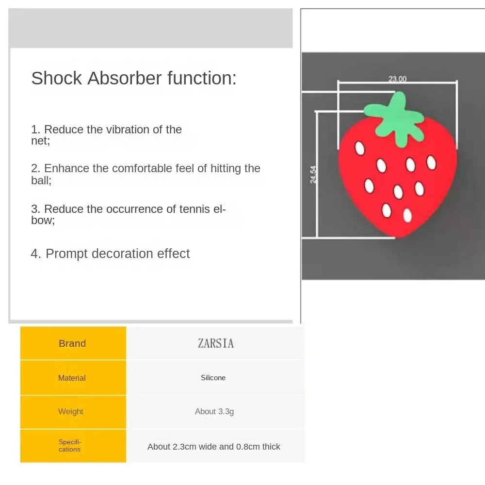 Espesor: aproximadamente 0,8 cm (0,31 pulgadas) Diámetro: aproximadamente 2,3 cm (0,91 pulgadas) Peso: aproximadamente 3,3G Material: silicona Lista de embalaje: 1 almohadilla de choque para raqueta de tenis Características: 1. Reduce la vibración de la red. 2. Mejora la sensación cómoda de golpear la pelota. 3. Reduce la aparición del codo de tenista. 4. Efecto decorativo
