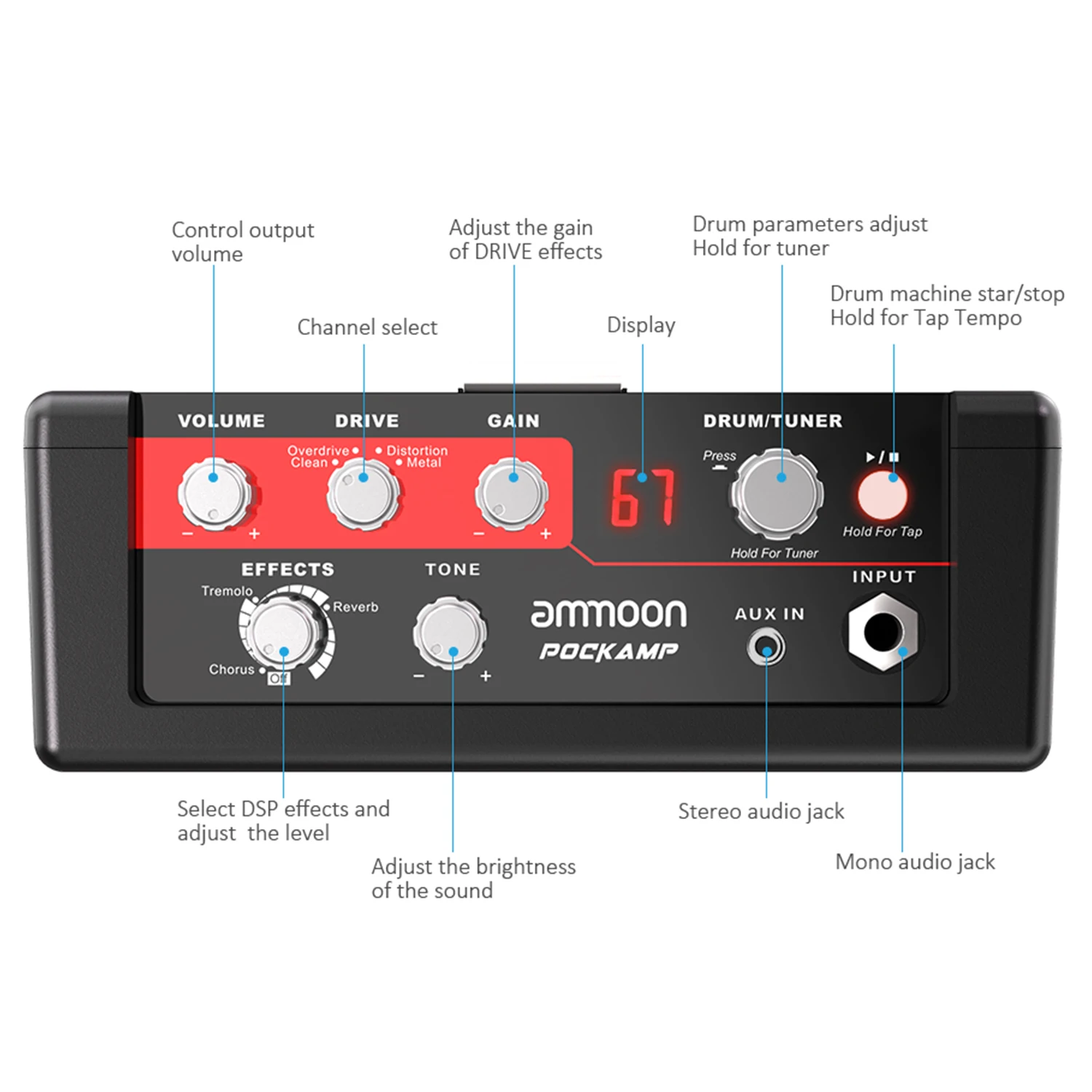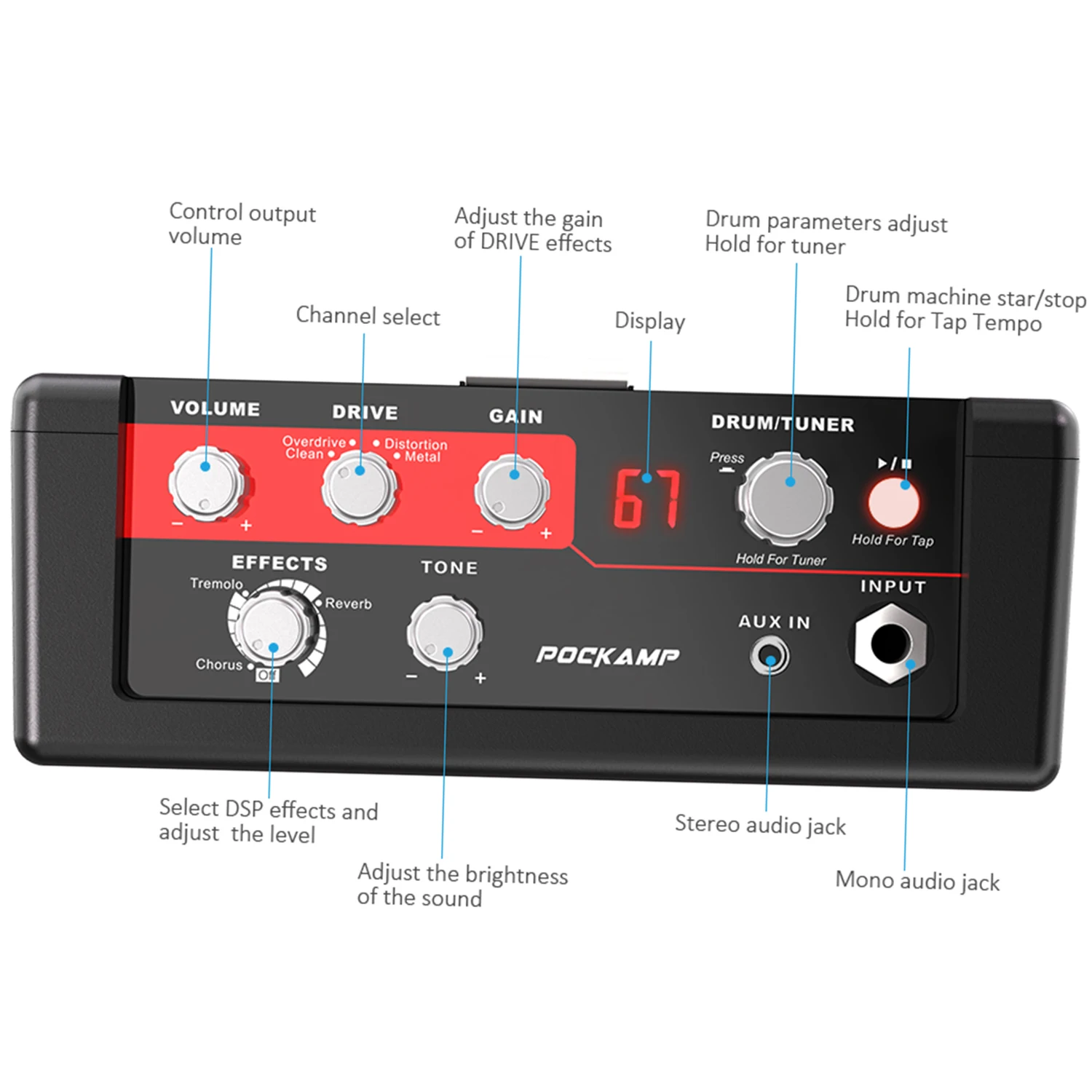 Cuenta con 80 ritmos de batería para tocar junto con tap tempo; 4 modelos DRIVE (Clean/Overdrive/Distortion/Metal) proporcionan un rango de ganancia para cada estilo musical; 3 Efectos DSP (Chorus/Tremolo/Reverb) para que puedas crear tus propios tonos de guitarra; Sintonizador incorporado para garantizar que tu instrumento esté siempre afinado.