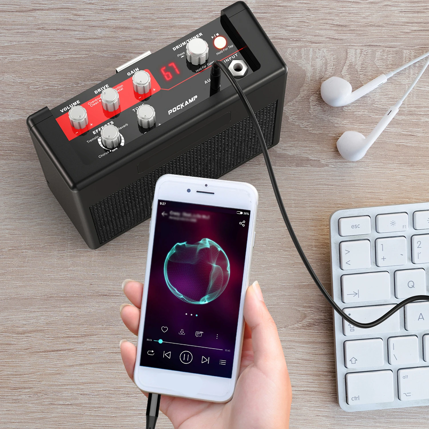 Atasca tus pistas favoritas simplemente conectando tu reproductor de MP3 a la entrada AUX de 1/8 "e instantáneamente te conviertes en parte de la banda; Y también puede practicar en privado y en silencio con el conector de salida de auriculares de 1/8".