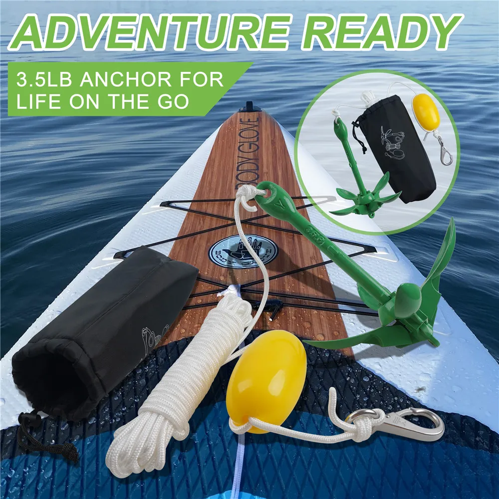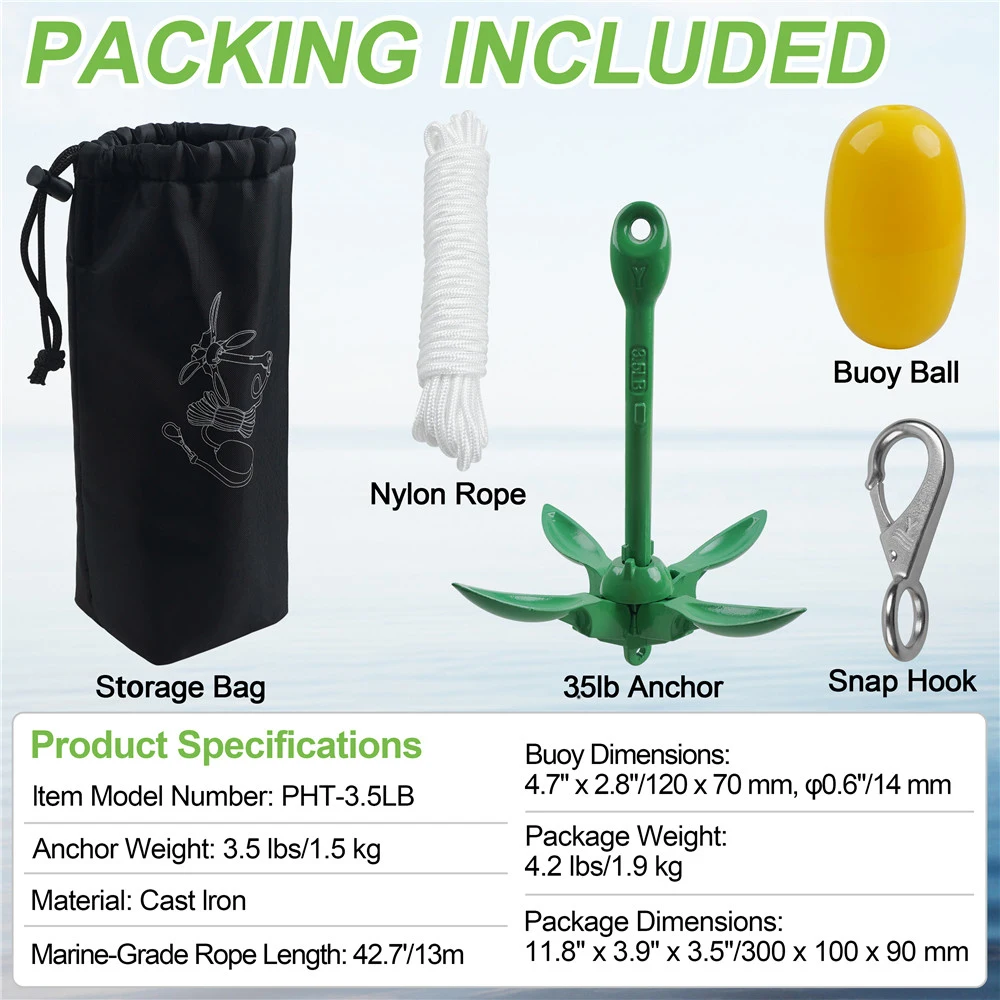1. Complete kayaking/paddle board anchoring kit including anchor(3.5lb/1.5kg), premium 8mm double braided 47.2ft/13m nylon rope, spring hook, Float and storage bag.