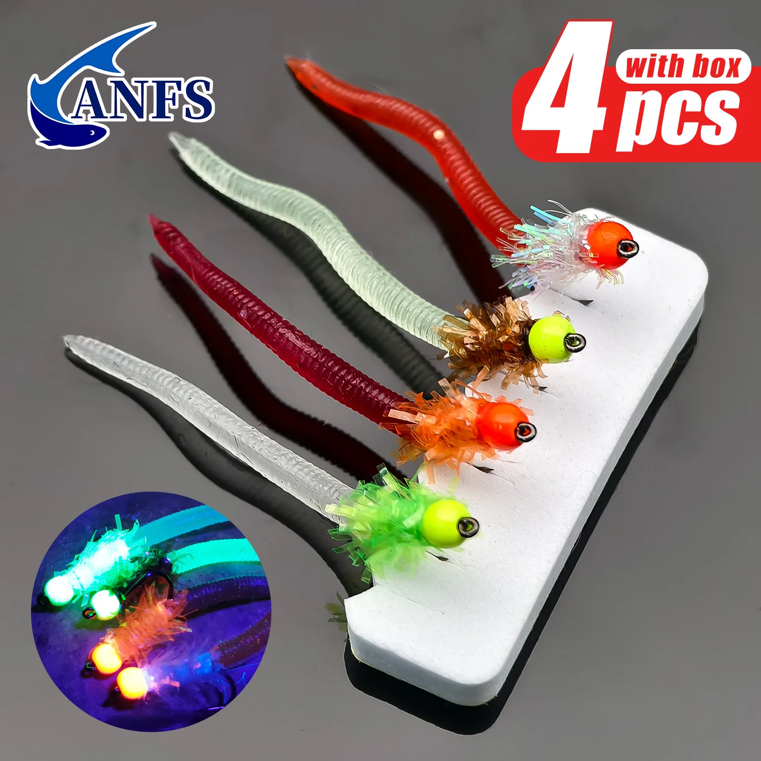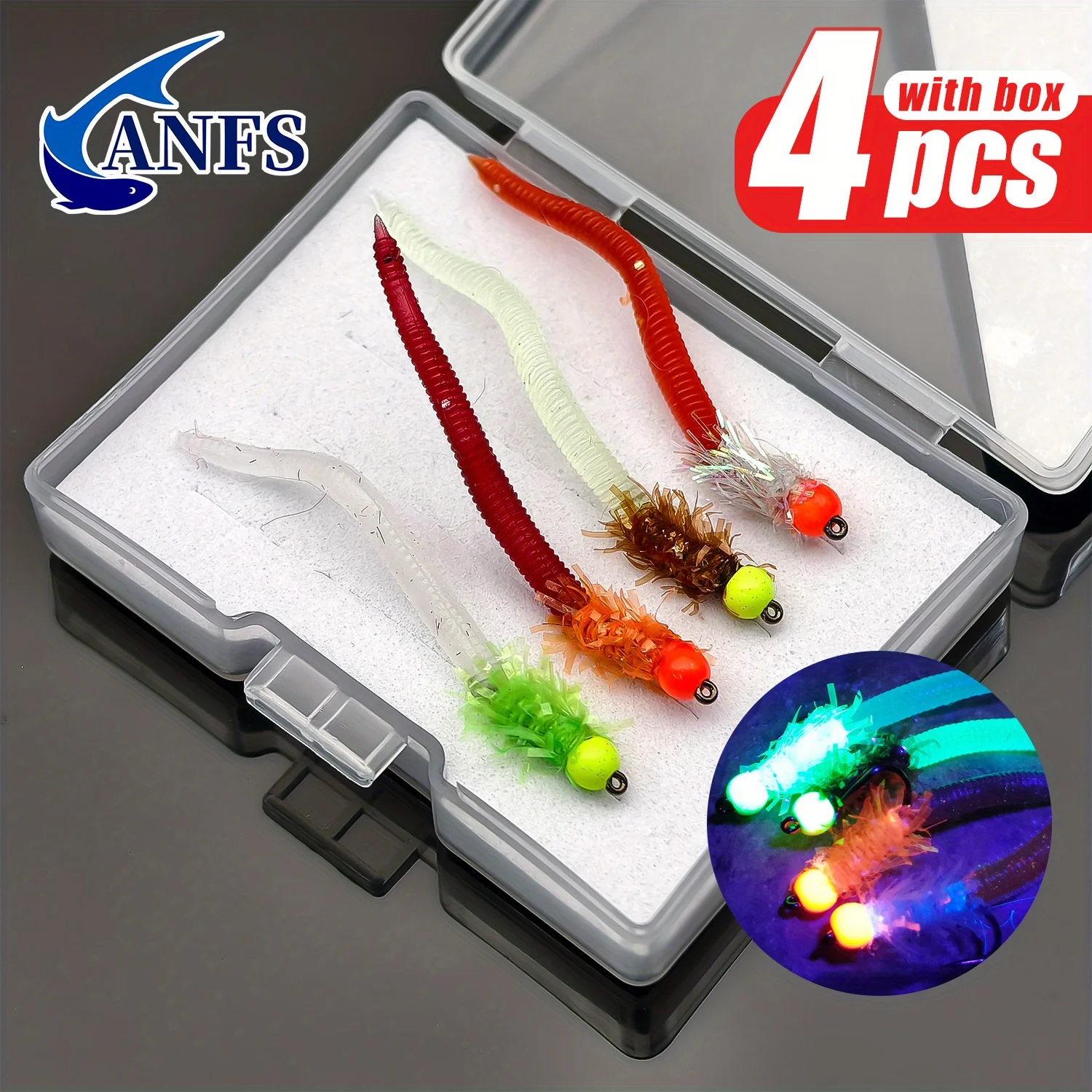 ANFS 4 Uds moscas de pesca con mosca con caja de almacenamiento-cebo suave para moscas de gusano, cosas de pesca geniales, angelköder