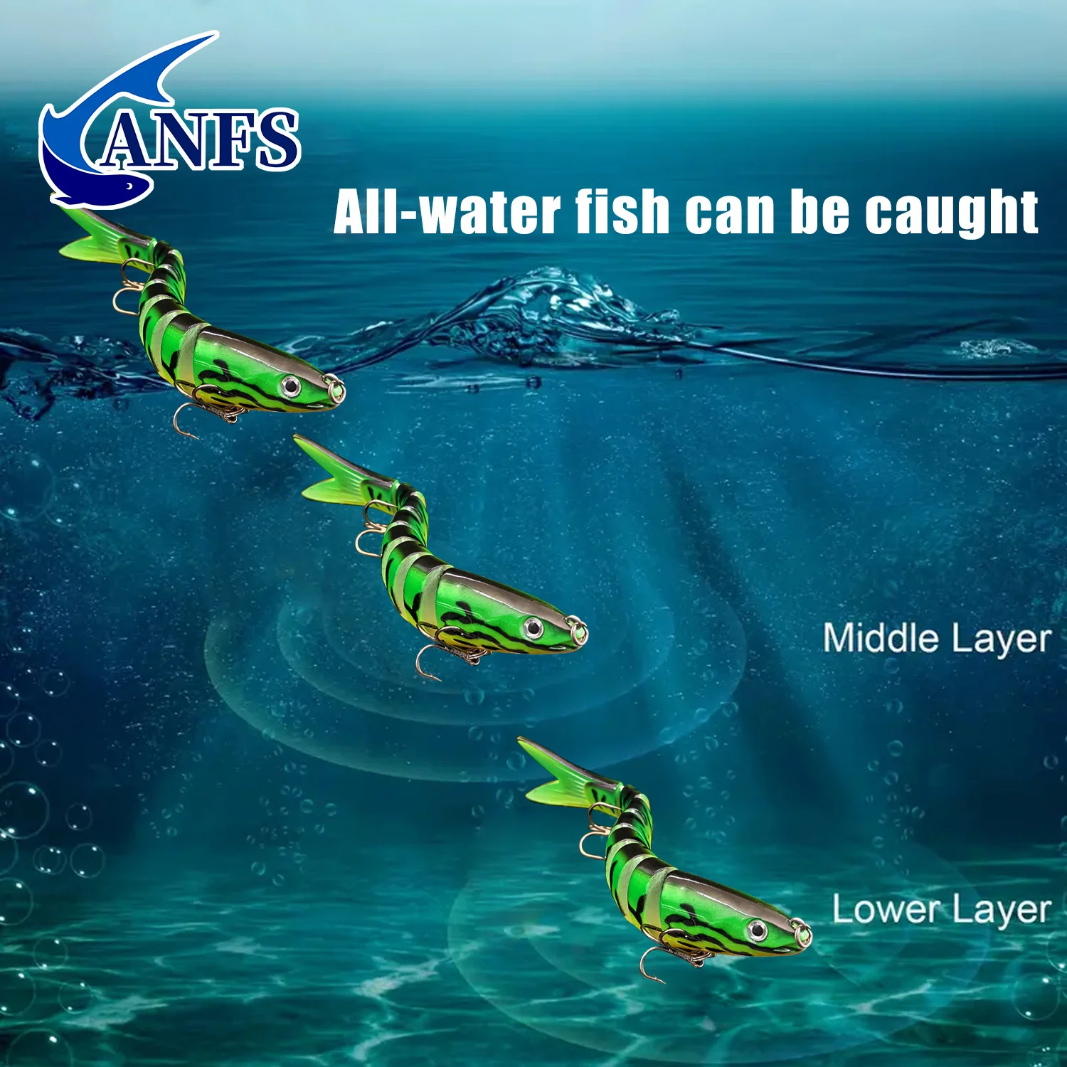 3) DISEÑO PREMIUM: 8 secciones diferentes del cuerpo de los señuelos de pesca están conectadas mediante una tela tejida resistente.El cebo de pesca es lo suficientemente fuerte como para soportar los ataques y mordeduras de peces grandes.