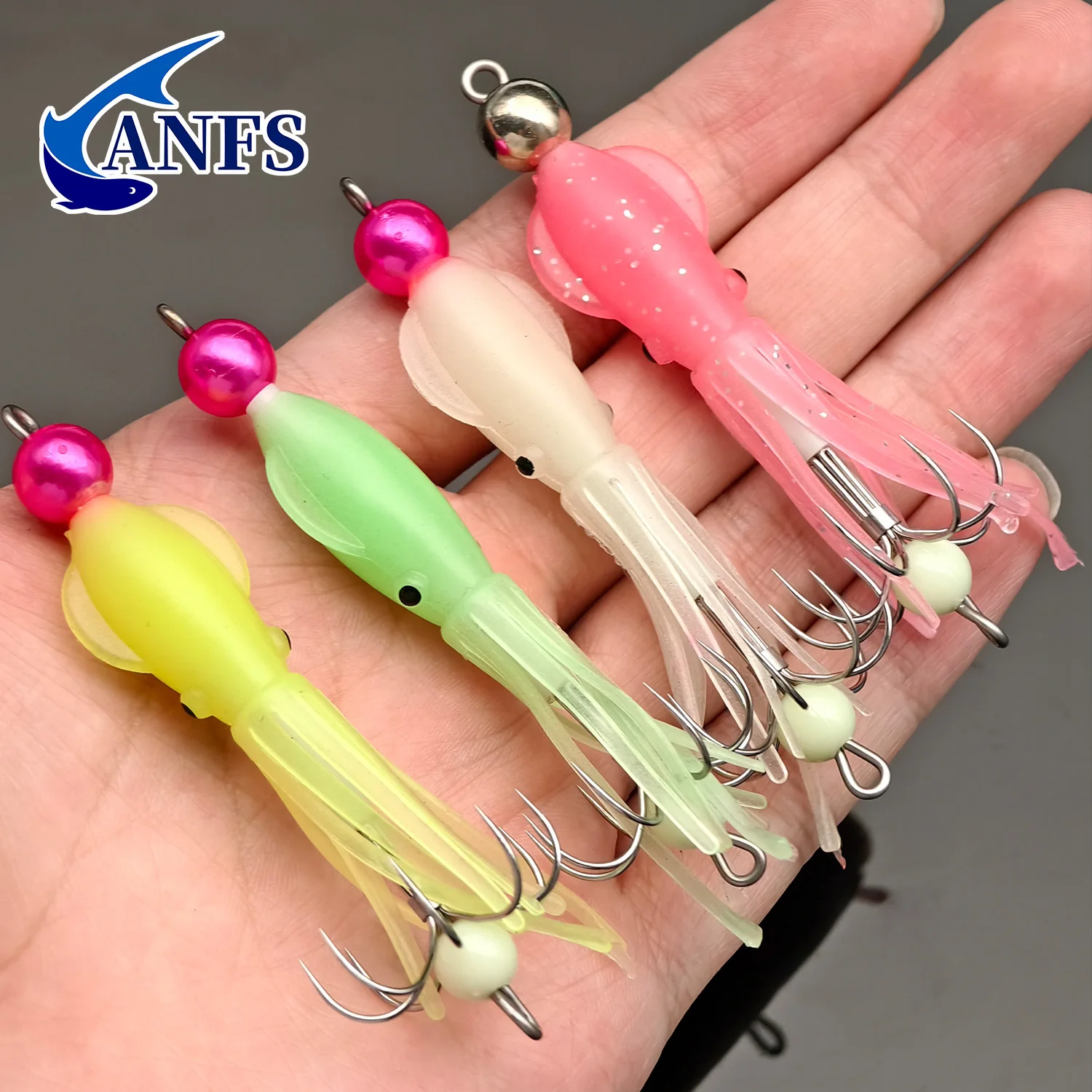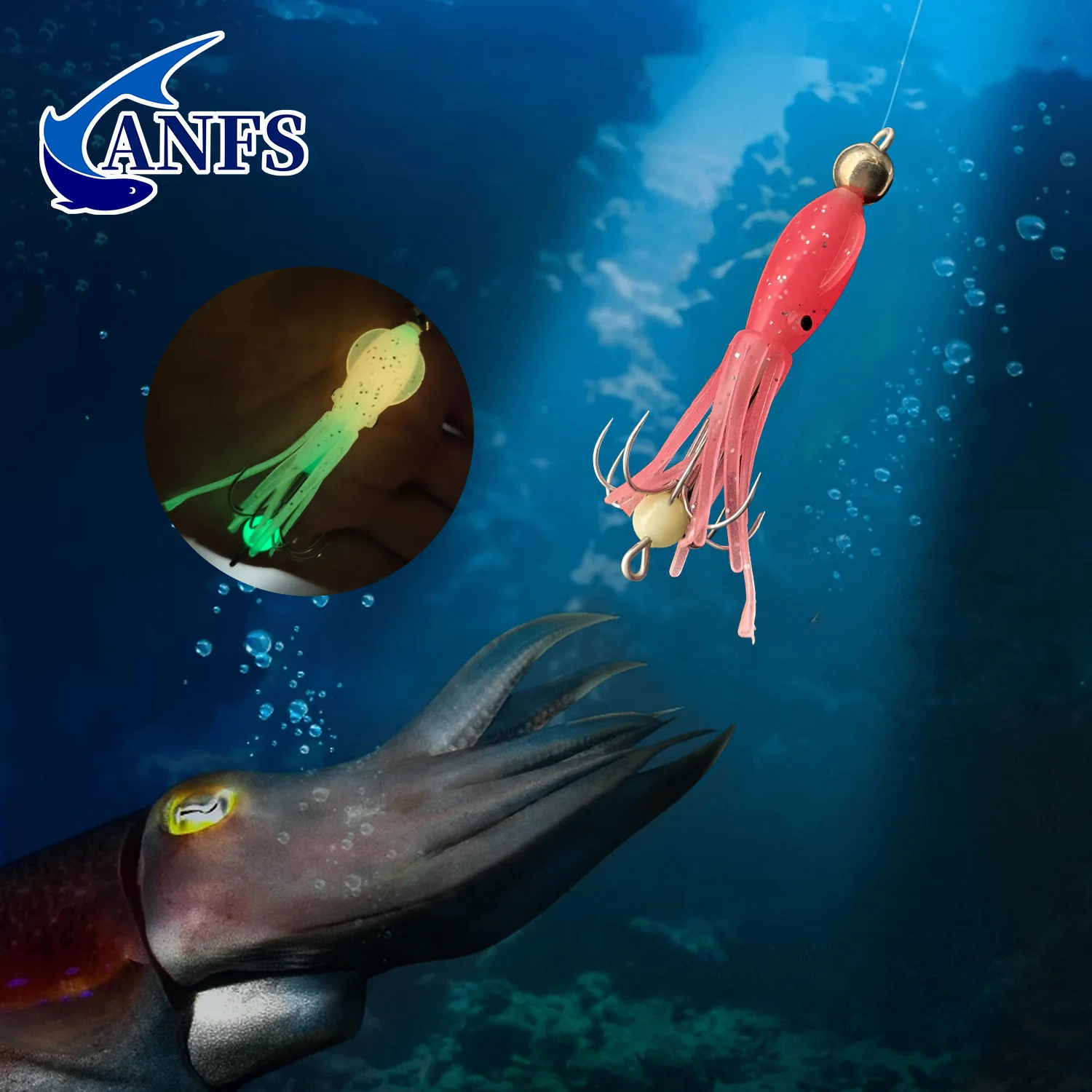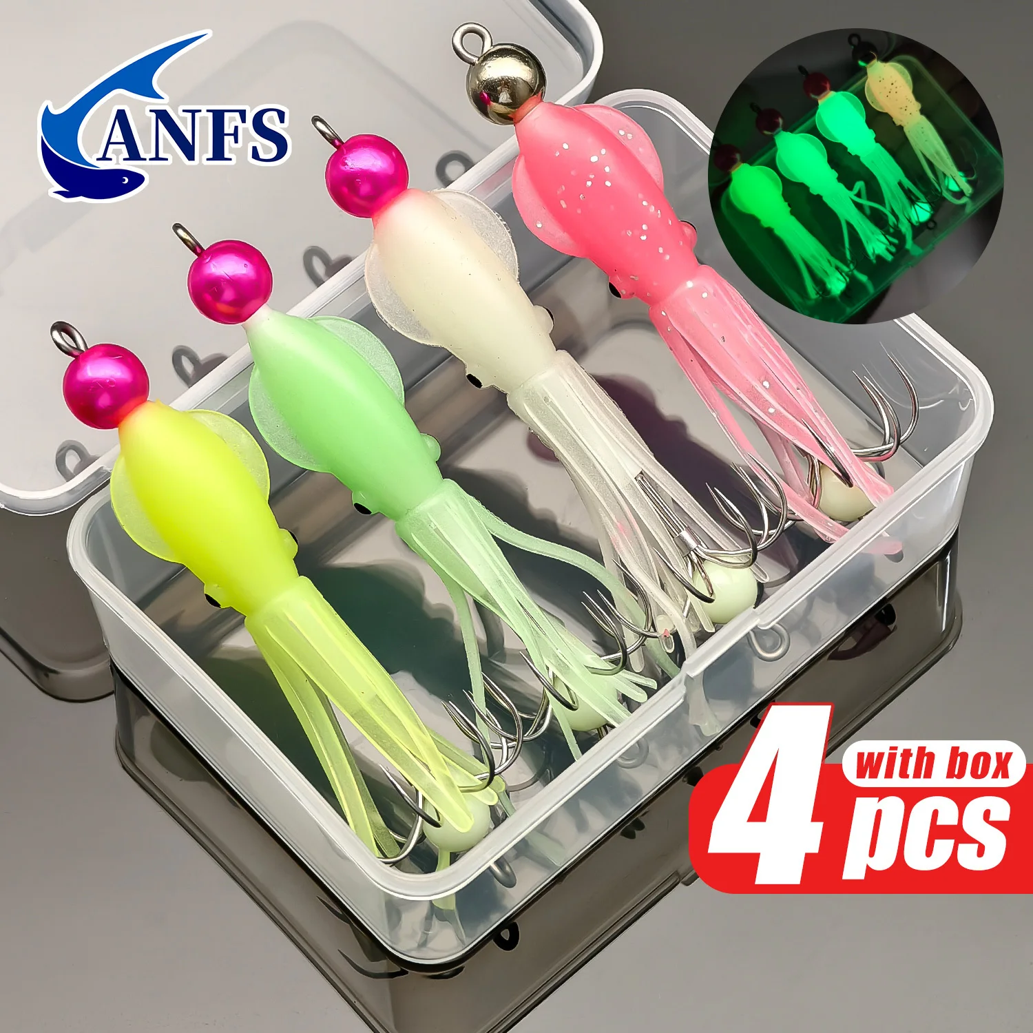 ANFS-cebo luminoso con anzuelo de calamar con caja, cebo suave que brilla en la oscuridad para pesca en el mar, plantillas de calamar suaves para una captura mejorada, 4 Uds.
