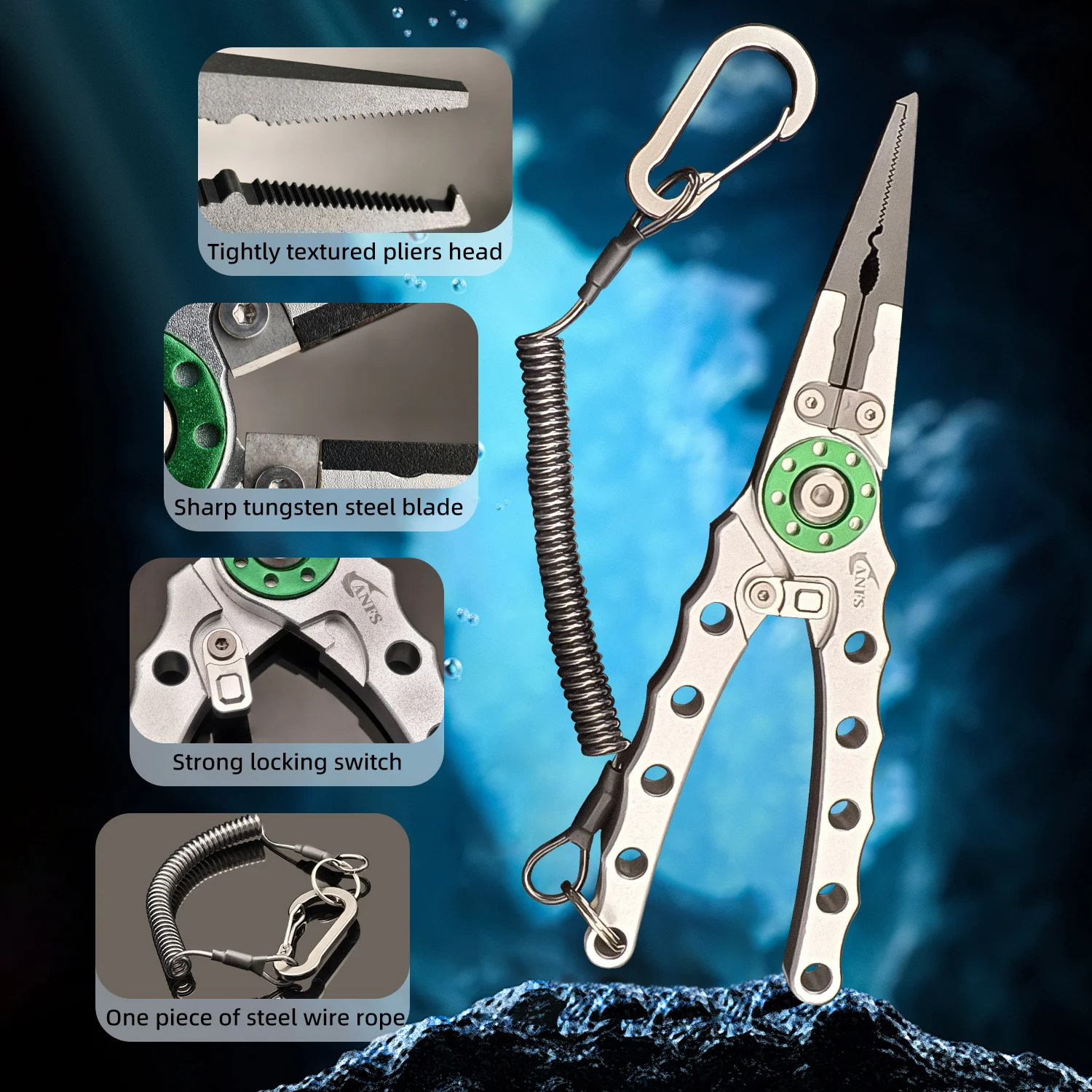 3) MULTIFUNCIÓN: puede cortar hilo de pescar con una hoja afilada de acero de tungsteno.El cabezal de los alicates no solo puede agarrar líneas, sino que también se puede usar como removedor de anzuelos. Las mordazas de acero de los alicates incluyen ranuras de engarzado para asegurar un peso de disparo dividido o construir un líder.