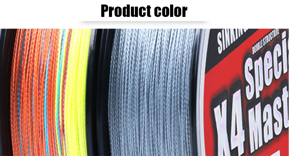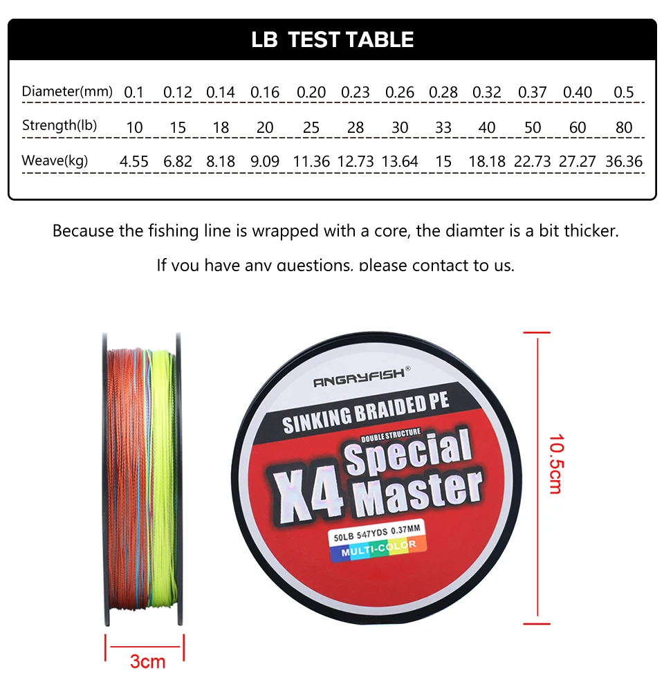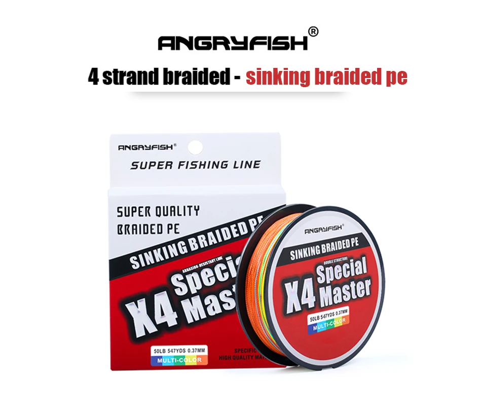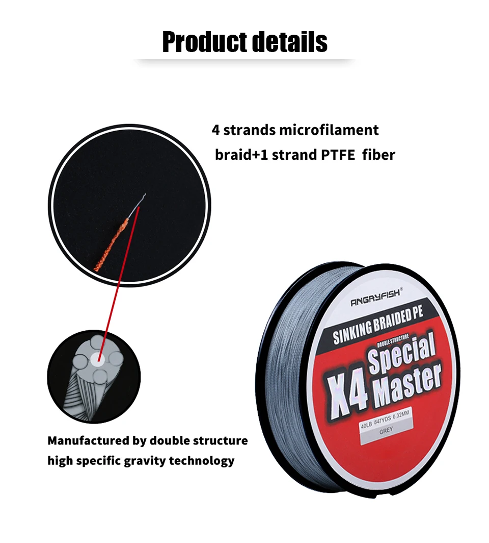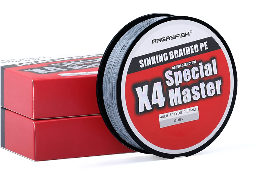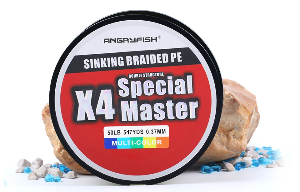 La línea Angryfish Special Master se compone de 4 hebras de fibra UHMWPE y una fibra especial de PTFE, doble certifre, tecnología de gravedad de alto especificación, que aumenta la proporción del hilo de pescar y se hunde en el agua más rápidamente.