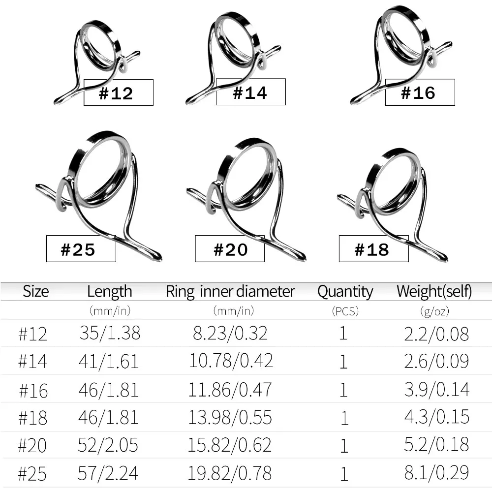 2.Selección de tamaño perfecta: ideal para cualquier persona que ama pescar con bricolaje.Hay 6 guías para cañas de pescar: 12#,14#,16#,18#,20#,25#