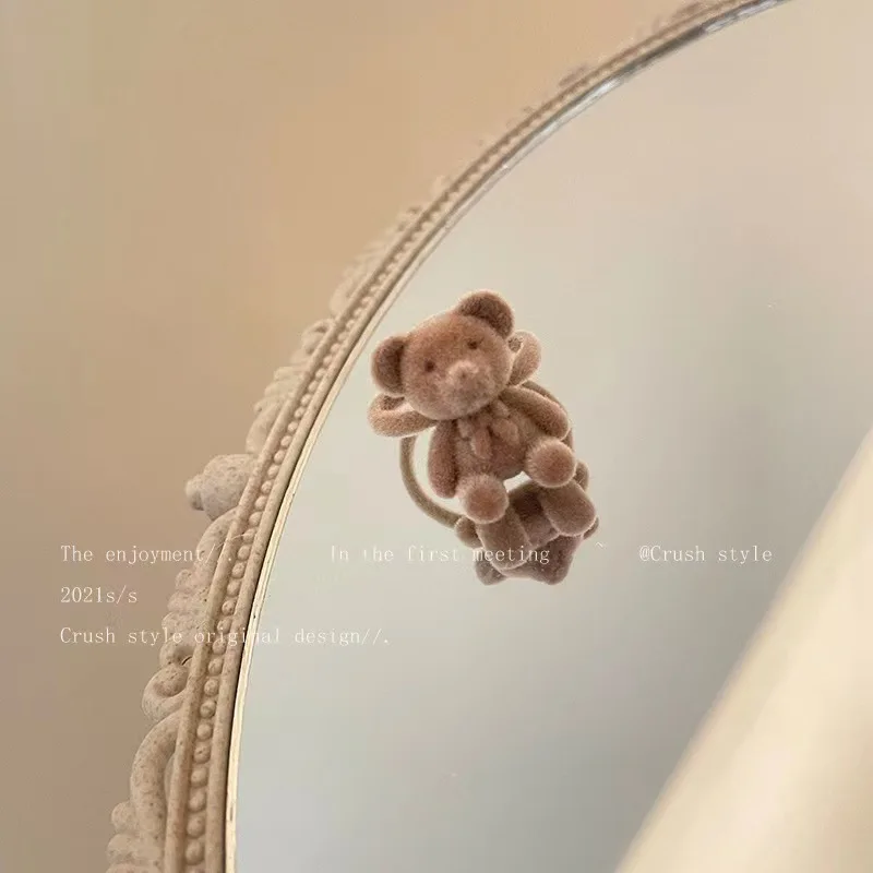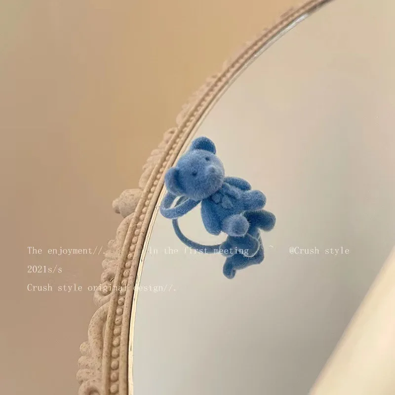 Anillo tridimensional de oso con lazo, anillo Flocado de corazón para niña linda, oso de terciopelo azul y rosa de Curry, Otoño e Invierno