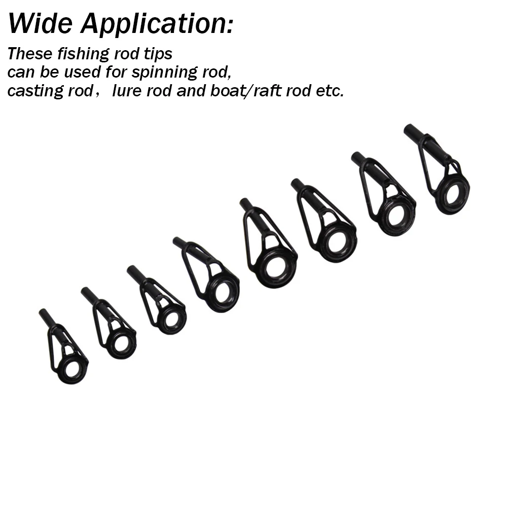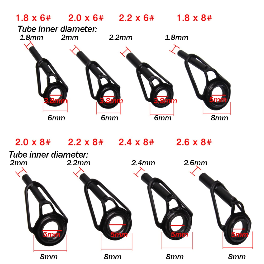Kit de reparación de puntas de caña de pescar con múltiples puntas en cada uno de una variedad de tamaños. La buena variedad de tamaños garantiza que probablemente encuentre un reemplazo de punta de caña de pescar adecuado, diámetro del tubo: 1,8mm * 6 #, 2,0mm * 6 #, 2,2mm * 6 #, 1,8mm * 8 #, 2,0mm * 8 #, 2,2mm * 8 #, 2,4mm * 8 #, 2,6mm * 8 #, 10mm * 8 # por tamaño, un total de 80 piezas.