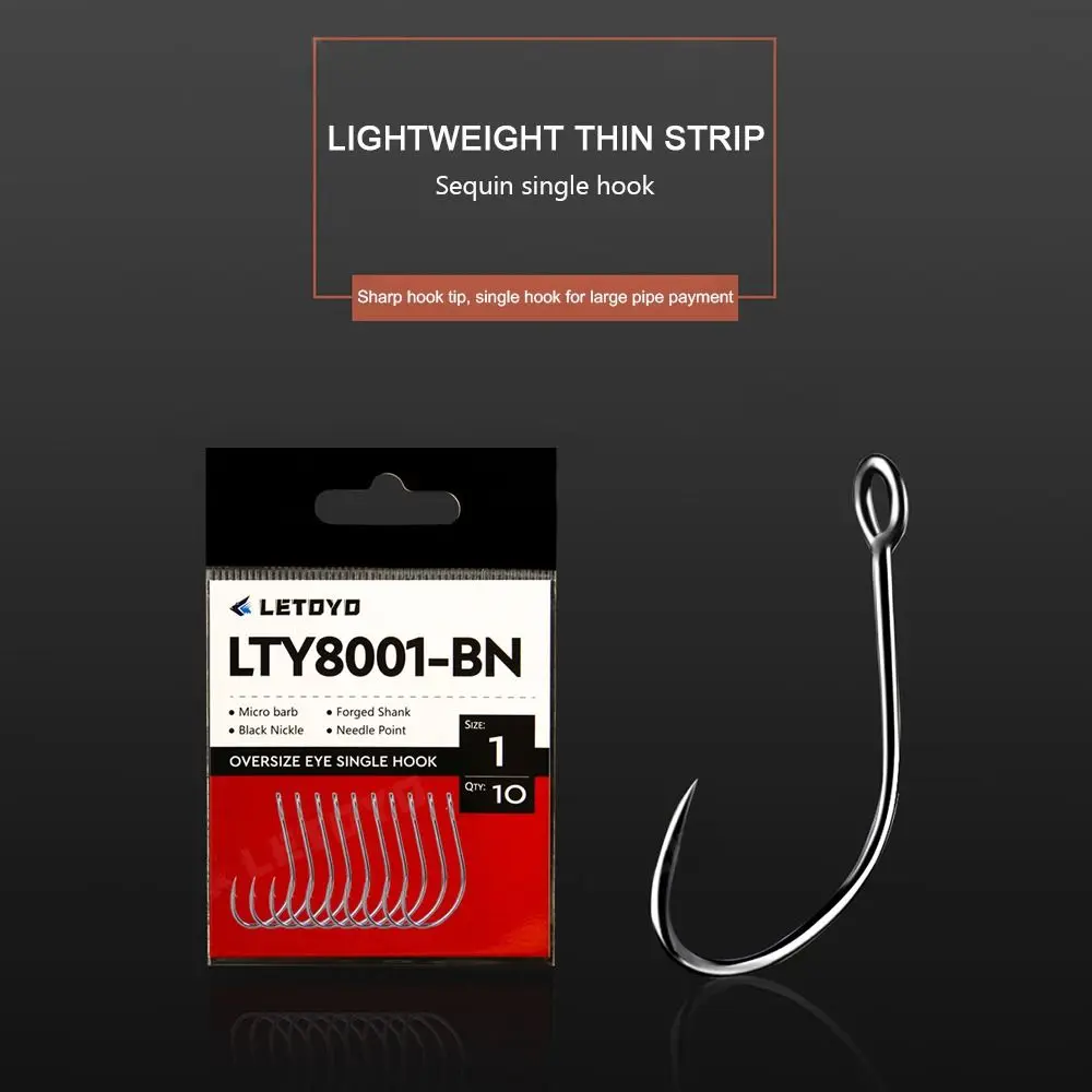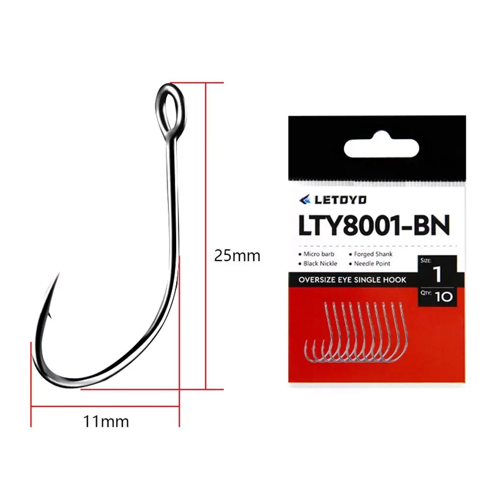 10pcs LETOYO forged shank Barbed oversize eye Fishhook for spoon lure High Carbon Steel black nickle spinner hook for Stream fishing - Made by high carbon stainless steel - Barbed hook - Long shank - Packaging in plastic box Packaging Quantity: 20pcs(2bag) Barbed hook Description: - Available size :1#-12#