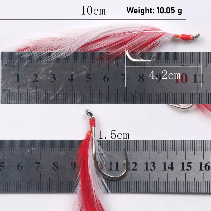 Longitud del artículo: (pluma) 10cm, (línea de pesca) 93cm, (gancho) 4cm