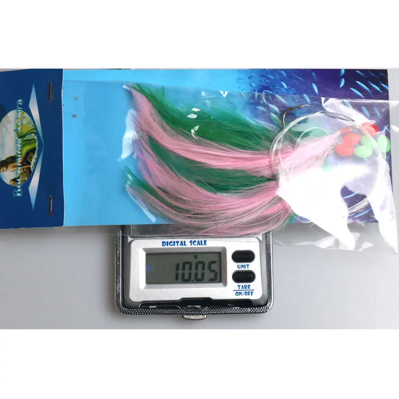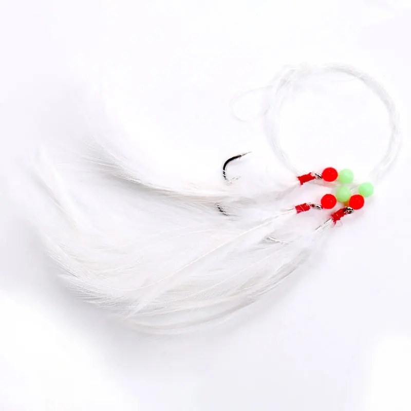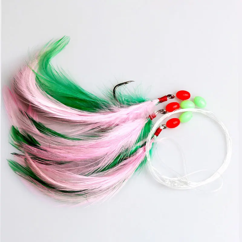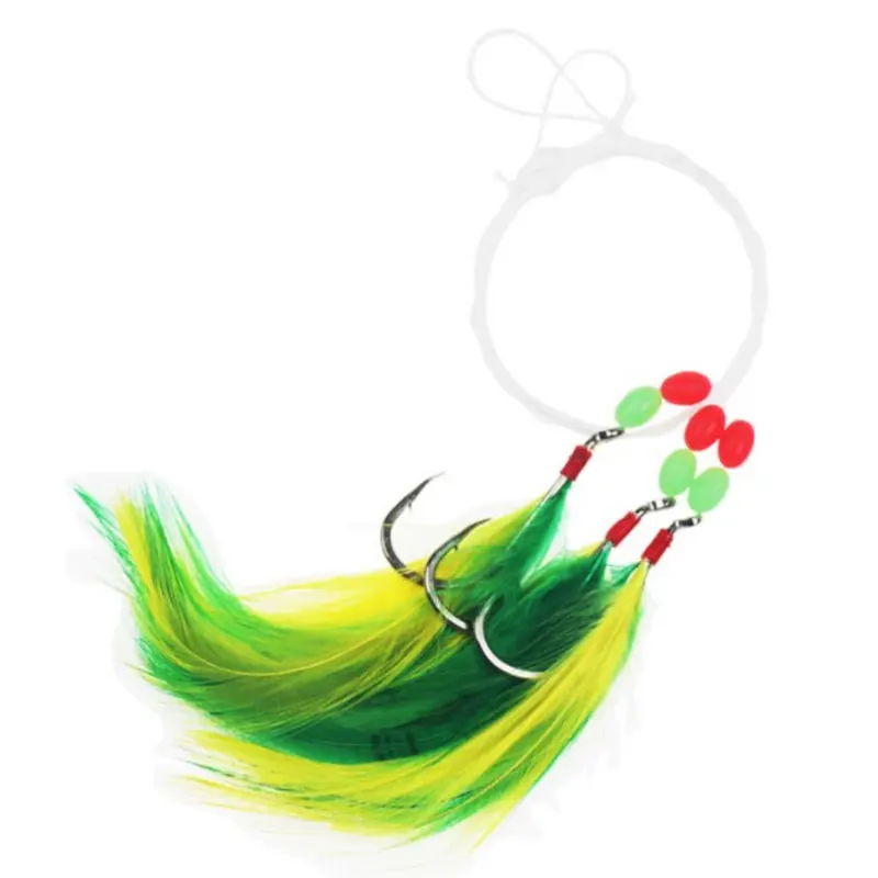 Los aparejos de agua salada contienen: anzuelos afilados + sedal + cuentas + plumas de pavo.