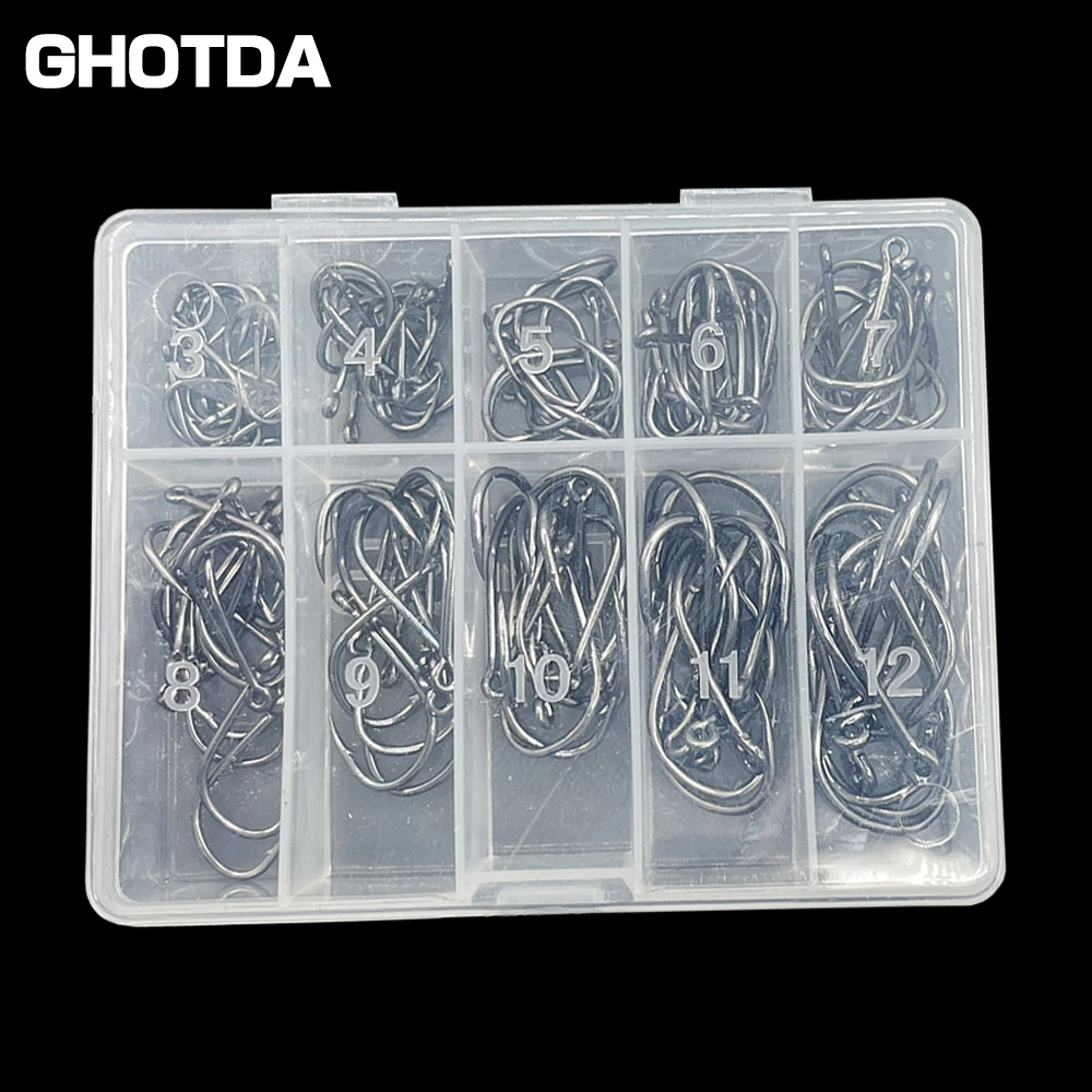 Función:100 piezas de anzuelos de pesca en diferentes tamaños de 3 a 12 #.