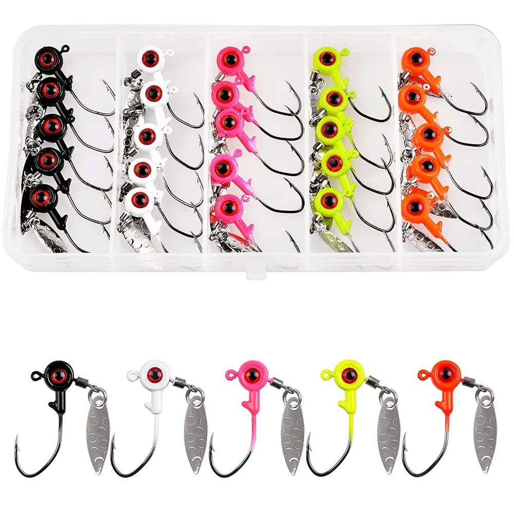 【UNIQUE DESIGN】Jig heads equipped with big bright eyes and a willow leaf blade,makes fishing jigs more attractive.spinner blade attached by a rolling fishing swivel,which produces a bright flash and keeps a continuous actions